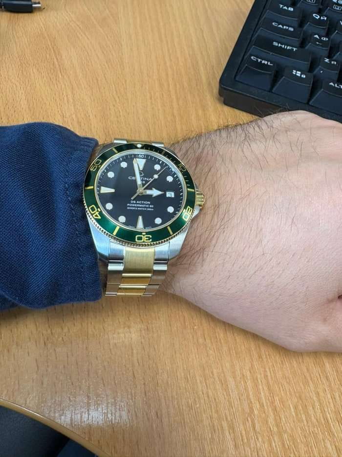 Швейцарские мужские механические часы Certina DS Action Diver 80 C0328072205101 из коллекции DS Action отражают непревзойдённый стиль с дайверским характером. Модель имеет яркий акцент в виде комбинированного циферблата. Крупная индикация времени позволяет считывать показания с циферблата в любой ситуации. Автоматический швейцарский калибр ETA Powermatic 80Powermatic 80Эксклюзивный калибр от швейцарской компании ETA с увеличенным запасом хода до 80 часов за счёт удлинённой заводной пружины. Характеризуется улучшенной системой спуска со сниженным трением. с резервом хода на 80 часов. Концепция DS ConceptDS ConceptDouble Security Concept, обозначает двойную надёжность и безупречную точность часов Certina. Двойная система защиты подразумевает обеспечение максимальной устойчивости к ударам и высоких показателей водонепроницаемости.. Сапфировое стекло. Алюминиевый вращающийся безельБезельВнешний ободок, закрепляющий стекло. В спортивных часах так называется поворотное кольцо с делениями на циферблате, выполняет роль таймера – замеряет отрезки времени на шкале. Неподвижный безель – элемент декора. Однонаправленно вращающийся безель на дайверских часах позволяет фиксировать моменты погружения и выныривания на поверхность.. Водонепроницаемость 300 метров. Люминесцентная подсветкаЛюминесцентное покрытиеПозволяет считывать показания времени в темноте. Производители наносят на стрелки, часовые индексы, безель или поверхность циферблата светонакопительный состав, дающий холодное свечение.. Стальной браслет с застёжкой, имеющей удлинение для дайверовУдлинение для дайверовЗастёжка с удлинением для дайверов представляет собой безопасное крепление, которое позволяет надевать часы поверх гидрокостюма. Гибкая застёжка удлиняется на 1-2 миллиметра.. Апертура даты. Диаметр корпуса: 38 мм. Производство и сборка: Швейцария.