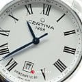 Элегантный стиль, широкий браслет, минималистичный циферблат, синие контрастные стрелки – модель выглядит ярко и в то же время строго. Это позволяет носить часы при любых обстоятельствах, Будь то повседневная прогулка или бизнес-встреча. Часы оснащены швейцарским автоматическим механизмом ETA Powermatic 80Powermatic 80Эксклюзивный калибр от швейцарской компании ETA с увеличенным запасом хода до 80 часов за счёт удлинённой заводной пружины. Характеризуется улучшенной системой спуска со сниженным трением. с увеличенным запасом хода до 80 часов. Циферблат дополнен сапфировым стеклом, антибликовое покрытие которого обеспечивает идеальную читаемость данных даже при ярком свете. Наручные часы отличаются ударопрочностью и водонепроницаемостью 100 метров благодаря фирменной концепции DS ConceptDS ConceptDouble Security Concept, обозначает двойную надёжность и безупречную точность часов Certina. Двойная система защиты подразумевает обеспечение максимальной устойчивости к ударам и высоких показателей водонепроницаемости.. Корпус и браслет сделаны из стали 316L, материал долговечен и устойчив к коррозии. На метке 6 часов размещено окошко даты. Диаметр корпуса: 39 мм.