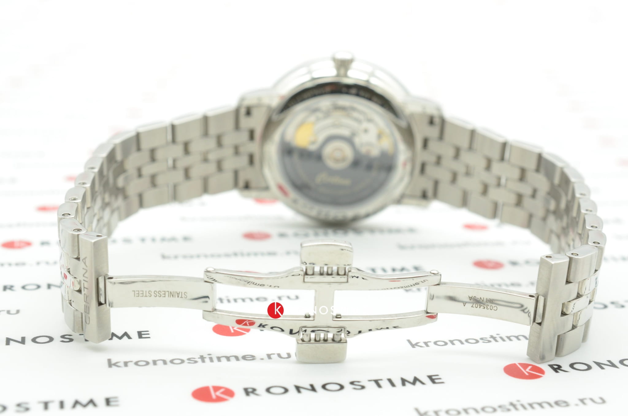Чёрный минималистичный циферблат выдержан в строгом и сдержанном стиле. Привлекательно смотрится стальной браслет с рядами звеньев различного размера. Часы с автоматической системой завода оснащены пружинным калибром ETA Powermatic 80Powermatic 80Эксклюзивный калибр от швейцарской компании ETA с увеличенным запасом хода до 80 часов за счёт удлинённой заводной пружины. Характеризуется улучшенной системой спуска со сниженным трением., имеющим с 80-часовой запас хода. Прозрачная задняя крышка. Надёжный корпус из антикоррозионной стали 316L. Концепция DS ConceptDS ConceptDouble Security Concept, обозначает двойную надёжность и безупречную точность часов Certina. Двойная система защиты подразумевает обеспечение максимальной устойчивости к ударам и высоких показателей водонепроницаемости.. Сапфировое стекло. Водонепроницаемость 10 бар. . Апертура даты. Диаметр корпуса: 39 мм.