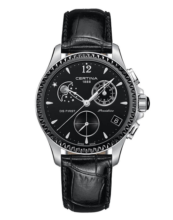 Окошко в положении 10 часов отображает лунные фазы, стильно смотрится бриллиантовая звезда. Кварцевый швейцарский механизм G10.962 Precidrive™Precidrive™Инновационный кварцевый механизм Certina. Часы, оснащённые этим швейцарским калибром, приравниваются к точности к сертифицированным хронометрам, точность хода составляет +/-10 секунд в год.. Керамический безельБезельВнешний ободок, закрепляющий стекло. В спортивных часах так называется поворотное кольцо с делениями на циферблате, выполняет роль таймера – замеряет отрезки времени на шкале. Неподвижный безель – элемент декора. Однонаправленно вращающийся безель на дайверских часах позволяет фиксировать моменты погружения и выныривания на поверхность. с гранёным краем. Чёрный кожаный ремешок. EOLEOLПредставляет собой систему, уведомляющую владельца часов о необходимости замены элемента питания. За 2 недели до полного разряда батарейки секундная стрелка перестаёт ходить чётко и начинает перепрыгивать на 3-4 деления., календарь, хронографХронографФункция позволяет измерять отрезки времени с особой точностью: часы, минуты, секунды. Верным признаком хронографа является наличие на циферблате 3 дополнительных окошек-счётчиков..