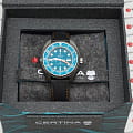 Certina DS SUPER PH1000M STC C024.907.17.041.10 – часы для поклонников ярких аксессуаров. Корпус изготовлен из высококачественной нержавеющей стали 316L с . Под твердым сапфировым стекломСапфировое стеклоПрочный и надёжный материал из кристалла сапфира синтетического происхождения, характеризующийся особой твёрдостью и устойчивостью к царапинам и повреждениям. с антибликовым покрытиемАнтибликовое покрытиеСлой оксида металла в 0,13-0,3 микрон, благодаря которому стекло часов не бликует и не отражает свет. Антибликовое покрытие уменьшает отражение света в 10 раз, обеспечивая отличную читаемость показателей циферблата. находится бирюзовый циферблат на котором вы найдете окошко даты в положении 3 часа, а также маркировку, покрытую люминесцентным покрытиемЛюминесцентное покрытиеПозволяет считывать показания времени в темноте. Производители наносят на стрелки, часовые индексы, безель или поверхность циферблата светонакопительный состав, дающий холодное свечение. Super-LumiNova. Все это приводится в действие автоматическим механизмом Powermatic 80Powermatic 80Эксклюзивный калибр от швейцарской компании ETA с увеличенным запасом хода до 80 часов за счёт удлинённой заводной пружины. Характеризуется улучшенной системой спуска со сниженным трением..611 с пружиной Nivachron™Nivachron™Специально разработанный инновационный сплав Nivachron™ повышает устойчивость часов к воздействию магнитных полей.. Класс водозащиты: 1000 метров, позволит плавать, нырять и заниматься другими водными видами спорта. Кожаный ремешок. БезельБезельВнешний ободок, закрепляющий стекло. В спортивных часах так называется поворотное кольцо с делениями на циферблате, выполняет роль таймера – замеряет отрезки времени на шкале. Неподвижный безель – элемент декора. Однонаправленно вращающийся безель на дайверских часах позволяет фиксировать моменты погружения и выныривания на поверхность. из нержавеющей стали с IP-покрытиемIP-покрытиеМетод ионного напыления. Демонстрирует повышенную устойчивость к истиранию, окислению и химическим веществам. Под воздействием высокого давления и температуры около 1500°C молекулы металла надёжно соединяются с частицами корпуса часов..