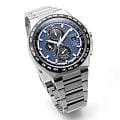Японские наручные часы Citizen AT8238-84L сочетают в себе передовые технологии, надежность и стильный современный дизайн. Корпус и браслет выполнены из высокопрочного материала Super Titanium, который в пять раз тверже и на 40% легче стали, а также отличается высокой устойчивостью к царапинам и коррозии, а на безельБезельВнешний ободок, закрепляющий стекло. В спортивных часах так называется поворотное кольцо с делениями на циферблате, выполняет роль таймера – замеряет отрезки времени на шкале. Неподвижный безель – элемент декора. Однонаправленно вращающийся безель на дайверских часах позволяет фиксировать моменты погружения и выныривания на поверхность. нанесено черное IP-покрытиеIP-покрытиеМетод ионного напыления. Демонстрирует повышенную устойчивость к истиранию, окислению и химическим веществам. Под воздействием высокого давления и температуры около 1500°C молекулы металла надёжно соединяются с частицами корпуса часов.. Диаметр корпуса составляет 43,5 мм, толщина — 10 мм, а вес — всего 90 грамм, что обеспечивает легкость и комфорт при ежедневном ношении. Часы оснащены кварцевым хронографомХронографФункция позволяет измерять отрезки времени с особой точностью: часы, минуты, секунды. Верным признаком хронографа является наличие на циферблате 3 дополнительных окошек-счётчиков. на солнечной батарее с системой Eco-Drive, не требующей замены батарейки, и калибром Citizen H800, обеспечивающим до 6 месяцев работы без подзарядки и защиту от перезаряда. Особенностью модели является автоматическая синхронизация времени по радиосигналу в четырех регионах мира, охватывающая 26 часовых зон, а также функция мирового времениМировое время Полезное часовое усложнение, отображающее время в основных городах и известных областях по всему миру, оно связано с часовыми поясами, удобно для путешественников и бизнесменов. и вечного календаряВечный календарьКлассическое часовое усложнение, представляющее собой календарь, рассчитанный на несколько лет вперёд (стандартно – до 2099 года). Определяет текущую дату, день недели, месяц., рассчитанного до 2100 года. На синем циферблате расположены центральные часовая и минутная стрелки с люминесцентным покрытиемЛюминесцентное покрытиеПозволяет считывать показания времени в темноте. Производители наносят на стрелки, часовые индексы, безель или поверхность циферблата светонакопительный состав, дающий холодное свечение. для отличной читаемости в темноте, а также апертура даты в позиции 3 часов и отдельный малый циферблат для секундной стрелки. Часы поддерживают 12/24-часовой формат времени, оснащены секундомеромСекундомерСекундоме́р — прибор, способный измерять интервалы времени с точностью до долей секунды. с точностью 1/20 секунды и максимальным временем измерения 60 минут, а также индикатором окончания ресурса элемента питания EOLEOLПредставляет собой систему, уведомляющую владельца часов о необходимости замены элемента питания. За 2 недели до полного разряда батарейки секундная стрелка перестаёт ходить чётко и начинает перепрыгивать на 3-4 деления.. Устойчивое к царапинам сапфировое стеклоСапфировое стеклоПрочный и надёжный материал из кристалла сапфира синтетического происхождения, характеризующийся особой твёрдостью и устойчивостью к царапинам и повреждениям. с антибликовым покрытиемАнтибликовое покрытиеС