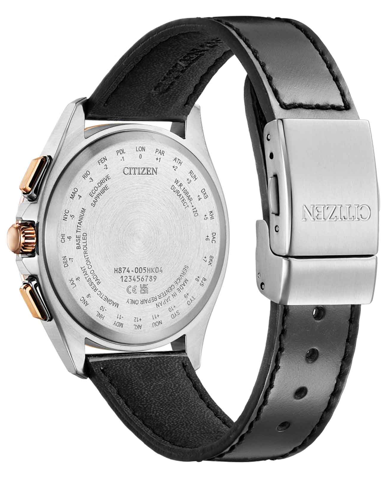 Часы Citizen BY1004-17X — это гармоничное сочетание современного японского стиля, передовых технологий и высокого уровня надежности. Модель выполнена в прочном и легком корпусе из инновационного суперлегкого титана Super Titanium Duratect TIC диаметром 41,5 мм и толщиной 10,8 мм, дополненном черны кожаным ремешком с раскладной застёжкойРаскладная застёжкаТакой тип застёжки используется только на браслетах из металла. Она никогда не раскрывается полностью, происходит разделение на 2 и более частей. Раскладывающая застёжка снизит вероятность потери часов к минимуму. подчеркивает солидный внешний вид модели. БезельБезельВнешний ободок, закрепляющий стекло. В спортивных часах так называется поворотное кольцо с делениями на циферблате, выполняет роль таймера – замеряет отрезки времени на шкале. Неподвижный безель – элемент декора. Однонаправленно вращающийся безель на дайверских часах позволяет фиксировать моменты погружения и выныривания на поверхность. с элегантным золотистым DLC-покрытиемDLC-покрытиеDiamond like carbon - одно из лучших видов покрытия, представляющее собой углерод с алмазными свойствами. На поверхность материала наносятся распавшиеся молекулы углерода, превращающиеся в плёнку из алмазоподобных связей, которая перенимает твёрдость алмаза.. Кварцевый механизм калибра Citizen H874 оснащен системой Eco-Drive, которая работает на солнечной энергии, не требуя замены батарейки, и обеспечивает запас хода до 180 дней. Часы отличаются высокой точностью хода — отклонение составляет всего +/- 15 секунд в месяц. Среди функциональных особенностей — автоматическая настройка времени по радиосигналу для Германии, Японии, США и Китая, вечный календарь, функция мирового времениМировое время Полезное часовое усложнение, отображающее время в основных городах и известных областях по всему миру, оно связано с часовыми поясами, удобно для путешественников и бизнесменов. , 12/24-часовой формат, автоматическое переключение летнего и зимнего времени, а также уникальный полностью автоматизированный радиоуправляемый механизм определения фаз Луны с возможностью отображения как для северного, так и южного полушария. На черном циферблате расположена апертура даты в положении 4 часа, все стрелки с люминесцентным покрытиемЛюминесцентное покрытиеПозволяет считывать показания времени в темноте. Производители наносят на стрелки, часовые индексы, безель или поверхность циферблата светонакопительный состав, дающий холодное свечение. для отличной читаемости в любое время суток. Устойчивое к царапинам сапфировое стеклоСапфировое стеклоПрочный и надёжный материал из кристалла сапфира синтетического происхождения, характеризующийся особой твёрдостью и устойчивостью к царапинам и повреждениям. с антибликовым покрытиемАнтибликовое покрытиеСлой оксида металла в 0,13-0,3 микрон, благодаря которому стекло часов не бликует и не отражает свет. Антибликовое покрытие уменьшает отражение света в 10 раз, обеспечивая отличную читаемость показателей циферблата. надежно защищает циферблат. Водозащита уровня WR 100 позволяет использовать часы при плавании без погружения.