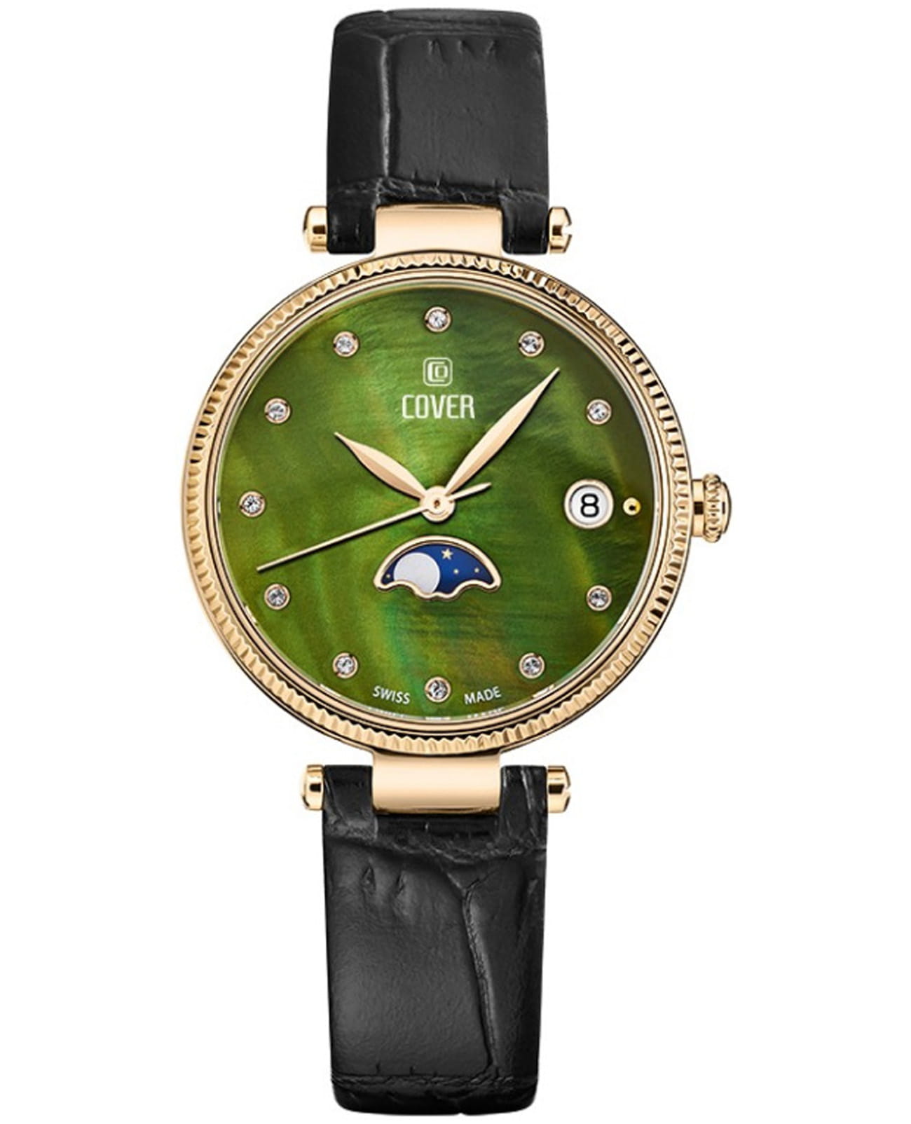 Женские часы Cover Moon CO196.06 - это аксессуар для истинных леди из коллекции Fly Me To The Moon. Часы работают на кварцевом калибре ETA. Циферблат выполнен в зеленом перламутровом исполнении, создавая игру света при каждом движении запястья, и украшен 11 кристаллами Swarovski, которые служат часовым индикатором, добавляя блики света и роскоши. Кроме того, модель имеет окно фаз Луны на «6 часах» и апертуру даты на «3 часах», что делает ее функциональной для ценителей астрономических усложнений. Часы имеют 32-миллиметровый корпус из нержавеющей стали с PVD-покрытиемPVDУльтратонкое покрытие наносится в технике вакуумного напыления, сочетает в себе нитрид титана особой прочности со слоем золота или оксида хрома. Несёт в себе декоративную или защитную функцию. цвета желтого золота. Водонепроницаемость часов достигает 5 атмосфер (WR 50), что позволяет использовать их в повседневной жизни, однако не рекомендуется для контакта с водой во время плавания или дайвинга. Маркировка «Swiss Made». Кожаный ремешок на классической застежке.