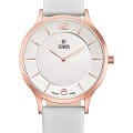 Женские наручные часы Cover CO2037.14 из коллекции Essential сочетают в себе классический дизайн и высокую точность швейцарского производства. Модель обладает круглым корпусом диаметром 38 мм, изготовленным из нержавеющей стали с PVD-покрытиемPVDУльтратонкое покрытие наносится в технике вакуумного напыления, сочетает в себе нитрид титана особой прочности со слоем золота или оксида хрома. Несёт в себе декоративную или защитную функцию. цвета розового золота, что придает изделию благородный внешний вид.  Для защиты используется сапфировое стеклоСапфировое стеклоПрочный и надёжный материал из кристалла сапфира синтетического происхождения, характеризующийся особой твёрдостью и устойчивостью к царапинам и повреждениям. с антибликовым покрытиемАнтибликовое покрытиеСлой оксида металла в 0,13-0,3 микрон, благодаря которому стекло часов не бликует и не отражает свет. Антибликовое покрытие уменьшает отражение света в 10 раз, обеспечивая отличную читаемость показателей циферблата., обеспечивающее прочную защиту от царапин и превосходную читаемость времени даже при ярком свете. Часы работают на высокоточном кварцевом механизме, гарантирующем исключительную точность хода с погрешностью около 20 секунд в месяц. Кожаный ремешок на классической застежке. Водонепроницаемость достигает 5 атмосфер (50 метров), что позволяет использовать их во время дождя и мытья рук, но не рекомендуется для плавания. Эти швейцарские часы станут идеальным дополнением как классического, так и современного образа.