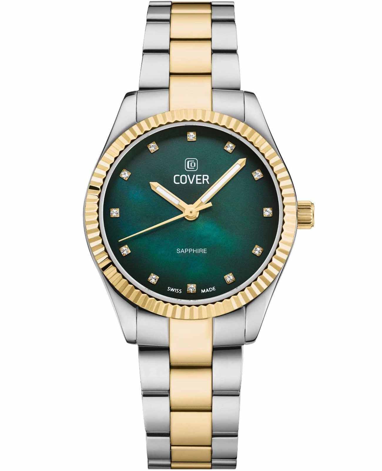 Часы Cover Valentina Mini CO224.03 воплощают в себе вечную элегантность благодаря своему чистому и утонченному дизайну. Корпус этих швейцарские часы изготовлен из полированной нержавеющей стали, а на браслет частично нанесено золотистое PVD-покрытиеPVDУльтратонкое покрытие наносится в технике вакуумного напыления, сочетает в себе нитрид титана особой прочности со слоем золота или оксида хрома. Несёт в себе декоративную или защитную функцию.. Они выделяются светящимся изумрудным циферблатом из перламутра. Золотистый рифленый безельБезельВнешний ободок, закрепляющий стекло. В спортивных часах так называется поворотное кольцо с делениями на циферблате, выполняет роль таймера – замеряет отрезки времени на шкале. Неподвижный безель – элемент декора. Однонаправленно вращающийся безель на дайверских часах позволяет фиксировать моменты погружения и выныривания на поверхность. с PVD-покрытиемPVDУльтратонкое покрытие наносится в технике вакуумного напыления, сочетает в себе нитрид титана особой прочности со слоем золота или оксида хрома. Несёт в себе декоративную или защитную функцию. и ослепительные хрустальные часовые метки создают непринужденно элегантный вид а светящиеся стрелки благодаря люминесцентному покрытиюЛюминесцентное покрытиеПозволяет считывать показания времени в темноте. Производители наносят на стрелки, часовые индексы, безель или поверхность циферблата светонакопительный состав, дающий холодное свечение. обеспечивают отличную читаемость и практичность. Эти швейцарские женские часы, идеально подходящие как для делового стиля, так и для повседневного образа, воплощают в себе универсальность и утонченность. Оснащенные устойчивым к царапинам сапфировым стекломСапфировое стеклоПрочный и надёжный материал из кристалла сапфира синтетического происхождения, характеризующийся особой твёрдостью и устойчивостью к царапинам и повреждениям., швейцарским кварцевым механизмом, эти часы соединяют надежность и элегантность. Завершает образ стальной браслет с раскладной застёжкойРаскладная застёжкаТакой тип застёжки используется только на браслетах из металла. Она никогда не раскрывается полностью, происходит разделение на 2 и более частей. Раскладывающая застёжка снизит вероятность потери часов к минимуму., который удобно сидит на запястье и обеспечивает надежную фиксацию. Часы обладают водозащитой уровня 50WR, что делает их подходящими для повседневного использования и активного образа жизни.