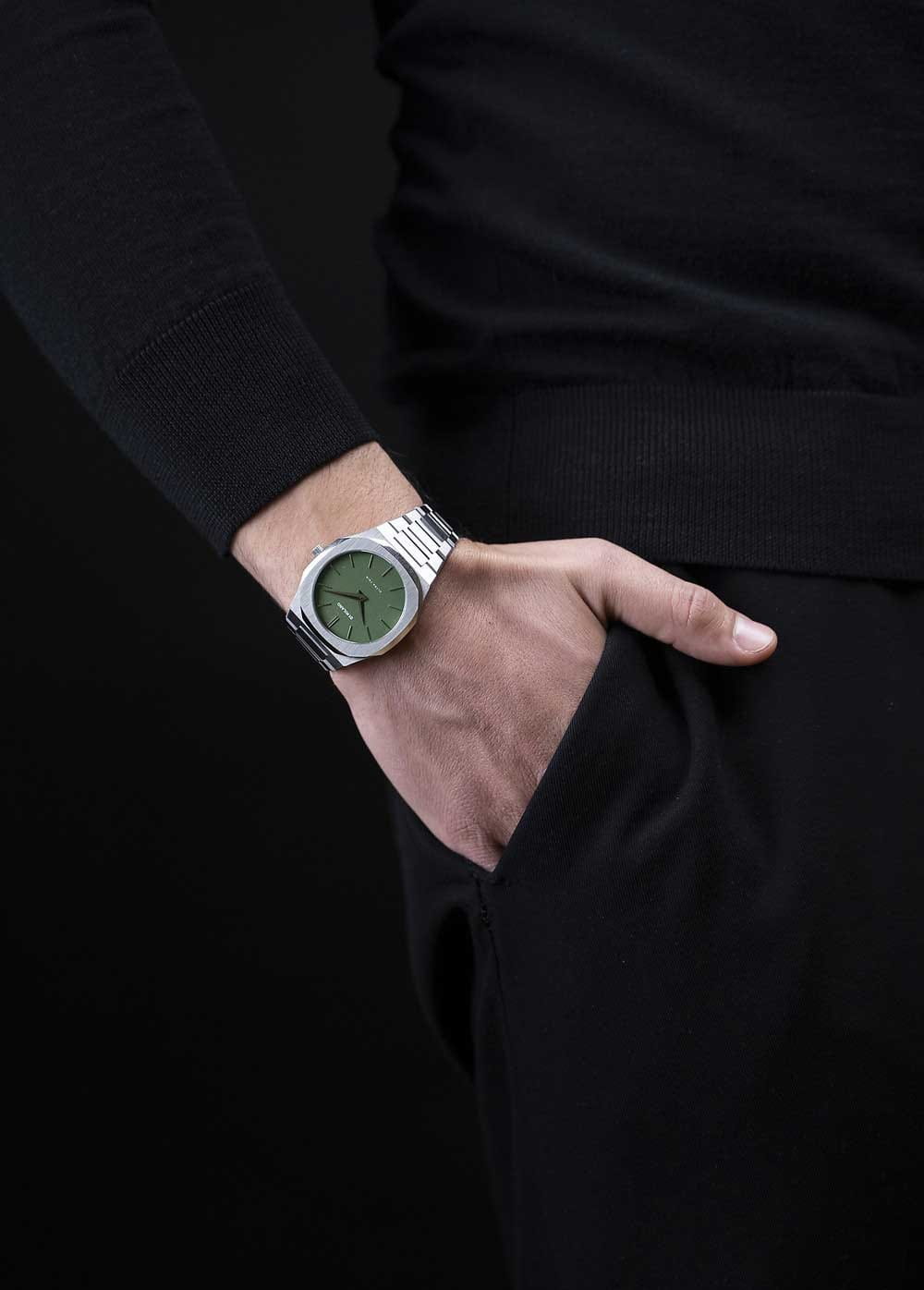 Часы D1 Milano UTBJ06 — это уникальные кварцевые часы, которые подчеркнут ваш изысканный стиль. Эти наручные часы из коллекции Ultra Thin с эффектным монохромным дизайном станут выразительным акцентом вашего образа. Корпус диаметром 40 мм из нержавеющей стали придает часам современный и утонченный вид. Зеленый циферблат метками в виде штрихов, а серебристые хроматические стрелки и индексы создают стильный контраст, подчёркивая элегантность модели. Задняя крышка из нержавеющей стали закреплена на 8-х винтах и дополнена индивидуальным серийным номером, что подчеркивает уникальность каждого экземпляра. Стальной браслет с раскладной застёжкойРаскладная застёжкаТакой тип застёжки используется только на браслетах из металла. Она никогда не раскрывается полностью, происходит разделение на 2 и более частей. Раскладывающая застёжка снизит вероятность потери часов к минимуму. обеспечивает надежность и комфорт в повседневном использовании. Сапфировое стеклоСапфировое стеклоПрочный и надёжный материал из кристалла сапфира синтетического происхождения, характеризующийся особой твёрдостью и устойчивостью к царапинам и повреждениям. с антибликовым покрытием защищает циферблат, а водозащита до 50WR делает эти часы практичным выбором для любых условий. Благодаря калибру Miyota 1L22, они отличаются точностью и надежностью. Эти итальянские часы представляют собой идеальное сочетание традиционного мастерства и инновационного подхода, воплощая в себе новый взгляд на классическую элегантность.