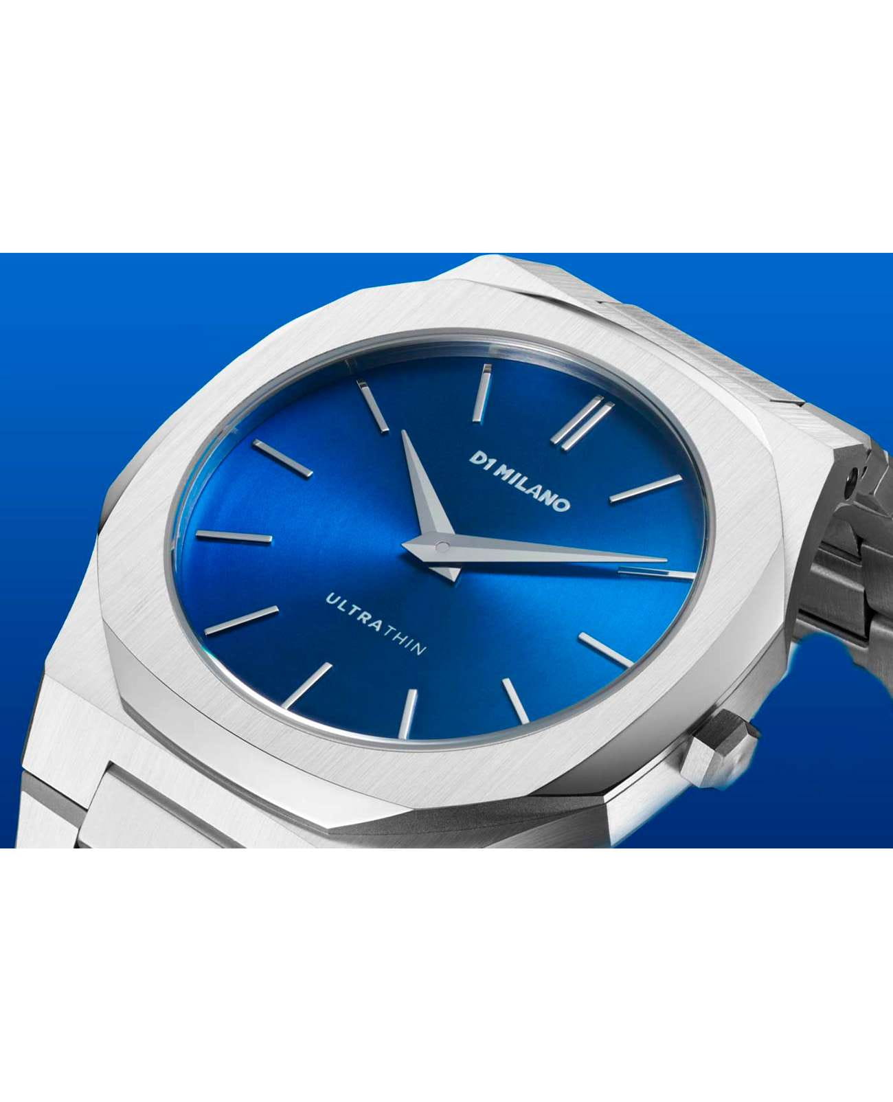 Наручные часы D1 Milano UTBL21 из коллекции Ultra Thin Mini Geo сочетают в себе элегантный дизайн и современные технологии. Модель обладает круглым корпусом диаметром 34 мм, изготовленным из нержавеющей стали, что обеспечивает высокую устойчивость к внешним воздействиям. Для защиты циферблата используется сапфировое стеклоСапфировое стеклоПрочный и надёжный материал из кристалла сапфира синтетического происхождения, характеризующийся особой твёрдостью и устойчивостью к царапинам и повреждениям., которое эффективно противостоит царапинам и механическим повреждениям. Часы оснащены кварцевым механизмом Miyota 1L22, гарантирующим точное время без необходимости подзаводки. Водонепроницаемость модели достигает 5 атмосфер (50 метров), что позволяет использовать их при контакте с водой, например, во время мытья рук или дождя. Браслет выполнен из нержавеющей стали с раскладной застежкойРаскладной замокДанный вариант застежки используется только на часах с металлическим браслетом. Отличительная особенность такого крепления в том, что длина браслета становится универсальной и вы можете самостоятельно отрегулировать нужный вам размер – застежка просто двигается по браслету часов., обеспечивающей комфортное ношение и безопасность. Циферблат синего цвета с метками в виде штрихов, что придает часам особую изысканность и делает их идеальным выбором для повседневного использования или особых случаев.