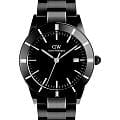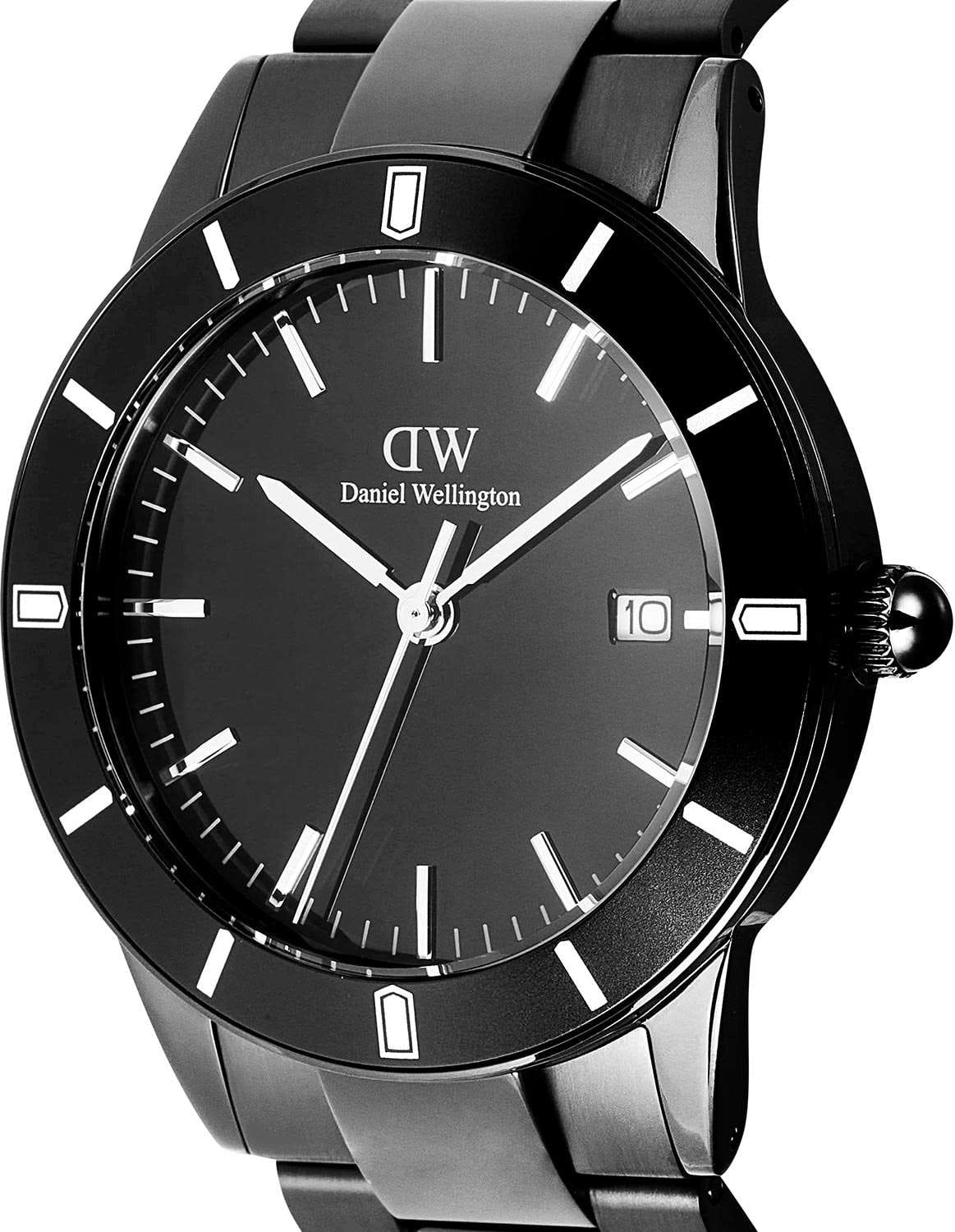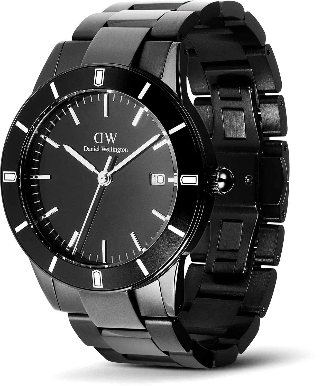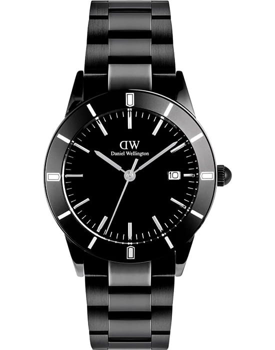 Daniel Wellington — мужские часы в современном спортивно-элегантном стиле. Круглый корпус диаметром 40 мм изготовлен из нержавеющей стали с PVD-покрытиемPVDУльтратонкое покрытие наносится в технике вакуумного напыления, сочетает в себе нитрид титана особой прочности со слоем золота или оксида хрома. Несёт в себе декоративную или защитную функцию. и дополнен чёрным безелемБезельВнешний ободок, закрепляющий стекло. В спортивных часах так называется поворотное кольцо с делениями на циферблате, выполняет роль таймера – замеряет отрезки времени на шкале. Неподвижный безель – элемент декора. Однонаправленно вращающийся безель на дайверских часах позволяет фиксировать моменты погружения и выныривания на поверхность. из анодированного алюминия, которое придаёт модели выразительный характер.