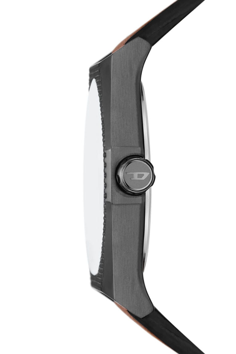 Мужские наручные часы с минеральным стекломМинеральное стеклоМинеральное стекло представляет собой искусственно выращенный минерал кварца. Такое стекло отличается особой устойчивостью к повреждениям и царапинам. Уступает по некоторым качествам сапфировому стеклу. Diesel Scraper DZ2189, кварцевый механизм с высокой точностью. Класс водозащиты: 50 метров, позволит защитить корпус от случайных брызг или капель дождя. Корпус часов изготовлен из нержавеющей стали с IP-покрытиемIP-покрытиеМетод ионного напыления. Демонстрирует повышенную устойчивость к истиранию, окислению и химическим веществам. Под воздействием высокого давления и температуры около 1500°C молекулы металла надёжно соединяются с частицами корпуса часов.. Кожаный ремешок на стандартной застёжке. Метки в виде штрихов и арабских цифр. Циферблат выполнен по технологии Sunray (солнечные лучи). Стрелки и метки с люминесцентным покрытиемЛюминесцентное покрытиеПозволяет считывать показания времени в темноте. Производители наносят на стрелки, часовые индексы, безель или поверхность циферблата светонакопительный состав, дающий холодное свечение..
