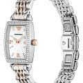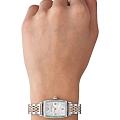 Женские кварцевые часы Emporio Armani из серии Gianni T-Bar — это элегантная новинка, сочетающая итальянский дизайн и японскую точность. Корпус выполнен из нержавеющей стали серебристого цвета и защищён минеральным стекломМинеральное стеклоМинеральное стекло представляет собой искусственно выращенный минерал кварца. Такое стекло отличается особой устойчивостью к повреждениям и царапинам. Уступает по некоторым качествам сапфировому стеклу.. Циферблат прямоугольной формы в перламутровом цвете оформлен римскими цифрами, придающими модели классический и изысканный вид. Браслет из нержавеющей с элементами PVD-покрытияPVDУльтратонкое покрытие наносится в технике вакуумного напыления, сочетает в себе нитрид титана особой прочности со слоем золота или оксида хрома. Несёт в себе декоративную или защитную функцию. стали фиксируется на застёжке «бабочка» с кнопкамиЗастёжка "бабочка"Такой вид застёжки дополняется предохранителями, помогающими избежать случайного раскрытия браслета. Обладают изящным исполнением. , обеспечивая удобство и надёжность ношения. Часы оснащены японским кварцевым механизмом, гарантирующим стабильную и точную работу. Водонепроницаемость составляет 30 WR, что позволяет использовать их в повседневных условиях, защищая от случайных брызг и капель дождя. Модель подчёркивает женственность и утончённый стиль, идеально дополняя любой образ.