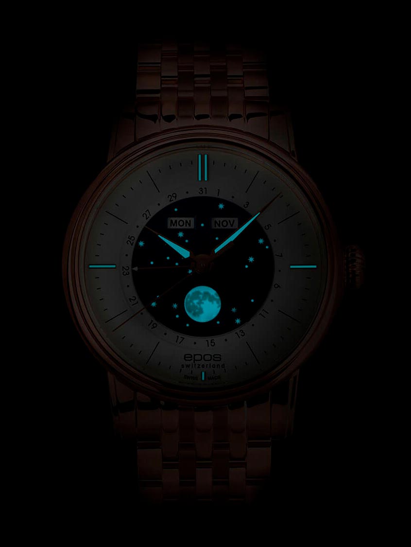Мужские швейцарские механические часы с автоподзаводом Epos Oeuvre d'art 3439.322.24.26.34. Сапфировое стеклоСапфировое стеклоПрочный и надёжный материал из кристалла сапфира синтетического происхождения, характеризующийся особой твёрдостью и устойчивостью к царапинам и повреждениям. устойчивое к появлению царапин, обладающее высокой прозрачностью. Корпус и браслет часов изготовлен из нержавеющей стали с PVD-покрытиемPVDУльтратонкое покрытие наносится в технике вакуумного напыления, сочетает в себе нитрид титана особой прочности со слоем золота или оксида хрома. Несёт в себе декоративную или защитную функцию.. В механизме 25 камней, частота 28800 полуколебаний в час. Запас хода 42 часа. Механизм декорирован узором Cotes de Geneve. Циферблат выполнен по технологии Sunray (солнечные лучи). В центре циферблат дополнен изображением ночного неба со светящимися звездами и большой светящейся луной луна с люминесцентной подсветкойЛюминесцентное покрытиеПозволяет считывать показания времени в темноте. Производители наносят на стрелки, часовые индексы, безель или поверхность циферблата светонакопительный состав, дающий холодное свечение.. Накладные метки в виде штрихов. Дата отображается центральной стрелкой. Окошко дня недели и месяца. Автоматический указатель фазы луны. Винтажная заводная головка. Прозрачная задняя крышка. Класс водозащиты: 50 метров, позволит защитить корпус от случайных брызг или капель дождя. Стальной браслет на раскладной застёжкеРаскладная застёжкаТакой тип застёжки используется только на браслетах из металла. Она никогда не раскрывается полностью, происходит разделение на 2 и более частей. Раскладывающая застёжка снизит вероятность потери часов к минимуму..