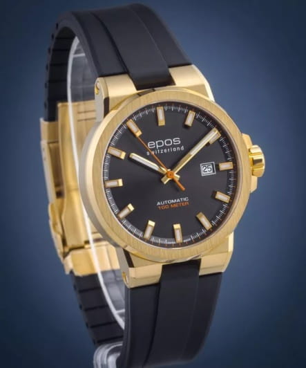 Мужские механические часы с автоподзаводом Epos из коллекции Sportive — это надёжный спортивный аксессуар с швейцарским качеством. Корпус диаметром 42 мм и толщиной 10,4 мм выполнен из нержавеющей стали 316L с PVD-покрытиемPVDУльтратонкое покрытие наносится в технике вакуумного напыления, сочетает в себе нитрид титана особой прочности со слоем золота или оксида хрома. Несёт в себе декоративную или защитную функцию.. Циферблат чёрного цвета с эффектом «солнечные лучи» оформлен аппликациями часовых индексов и крупными цифрами с покрытием цвета родия, а также яркими жёлтыми индексами, добавляющими динамики. Циферблат защищён сапфировым стекломСапфировое стеклоПрочный и надёжный материал из кристалла сапфира синтетического происхождения, характеризующийся особой твёрдостью и устойчивостью к царапинам и повреждениям.. Стрелки и метки с люминесцентным покрытиемЛюминесцентное покрытиеПозволяет считывать показания времени в темноте. Производители наносят на стрелки, часовые индексы, безель или поверхность циферблата светонакопительный состав, дающий холодное свечение. Super-Luminova, обеспечивающим отличную читаемость в темноте. Механизм — швейцарский калибр ETA 2824 с запасом хода 38 часов, декорированный узором «Côtes de Genève». Прозрачная задняя крышка позволяет наблюдать за работой механизма. Завинчивающаяся коронка обеспечивает дополнительную защиту. Часы оснащены каучуковым ремешком чёрного цвета с тиснением и раскладной застёжкойРаскладная застёжкаТакой тип застёжки используется только на браслетах из металла. Она никогда не раскрывается полностью, происходит разделение на 2 и более частей. Раскладывающая застёжка снизит вероятность потери часов к минимуму. с двойной блокировкой и защитным фиксатором. Водонепроницаемость 100 м позволяет использовать часы для плавания и других водных видов спорта. Гарантия — 24 месяца. Универсальный выбор для тех, кто ценит стиль, прочность и точность.