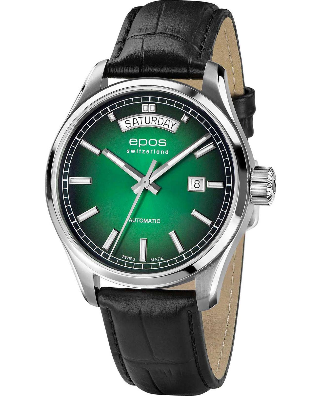 Мужские механические часы с автоподзаводом Epos из коллекции Passion — это сочетание швейцарского мастерства и современного дизайна. Корпус диаметром 41 мм и толщиной 11 мм выполнен из нержавеющей стали 316L. Циферблат зелёного цвета оформлен индексами и дополнен окошками даты и дня недели. Циферблат защищён сапфировым стекломСапфировое стеклоПрочный и надёжный материал из кристалла сапфира синтетического происхождения, характеризующийся особой твёрдостью и устойчивостью к царапинам и повреждениям.. Стрелки и метки с люминесцентным покрытиемЛюминесцентное покрытиеПозволяет считывать показания времени в темноте. Производители наносят на стрелки, часовые индексы, безель или поверхность циферблата светонакопительный состав, дающий холодное свечение., обеспечивающим хорошую читаемость в темноте. Прозрачная задняя крышка позволяет наблюдать за работой механизма. Часы оснащены кожаным ремешком чёрного цвета с раскладной застёжкойРаскладная застёжкаТакой тип застёжки используется только на браслетах из металла. Она никогда не раскрывается полностью, происходит разделение на 2 и более частей. Раскладывающая застёжка снизит вероятность потери часов к минимуму.. Водонепроницаемость 100 м позволяет использовать часы для плавания и повседневного ношения. Гарантия — 24 месяца. Универсальный выбор для ценителя механики и выразительного стиля.