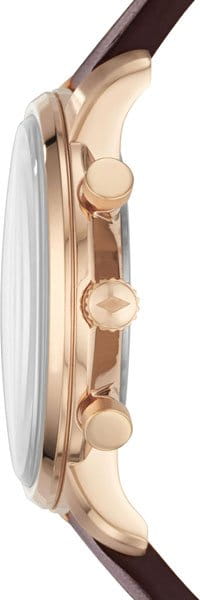 Мужской кварцевый хронограф Часы, минуты, секунды Индикация даты Корпус выполнен из нержавеющей стали с IP покрытием цвета розового золота Диаметр корпуса 44 мм, толщина 11 мм Кожаный ремешок Минеральное стекло Водостойкость WR 50