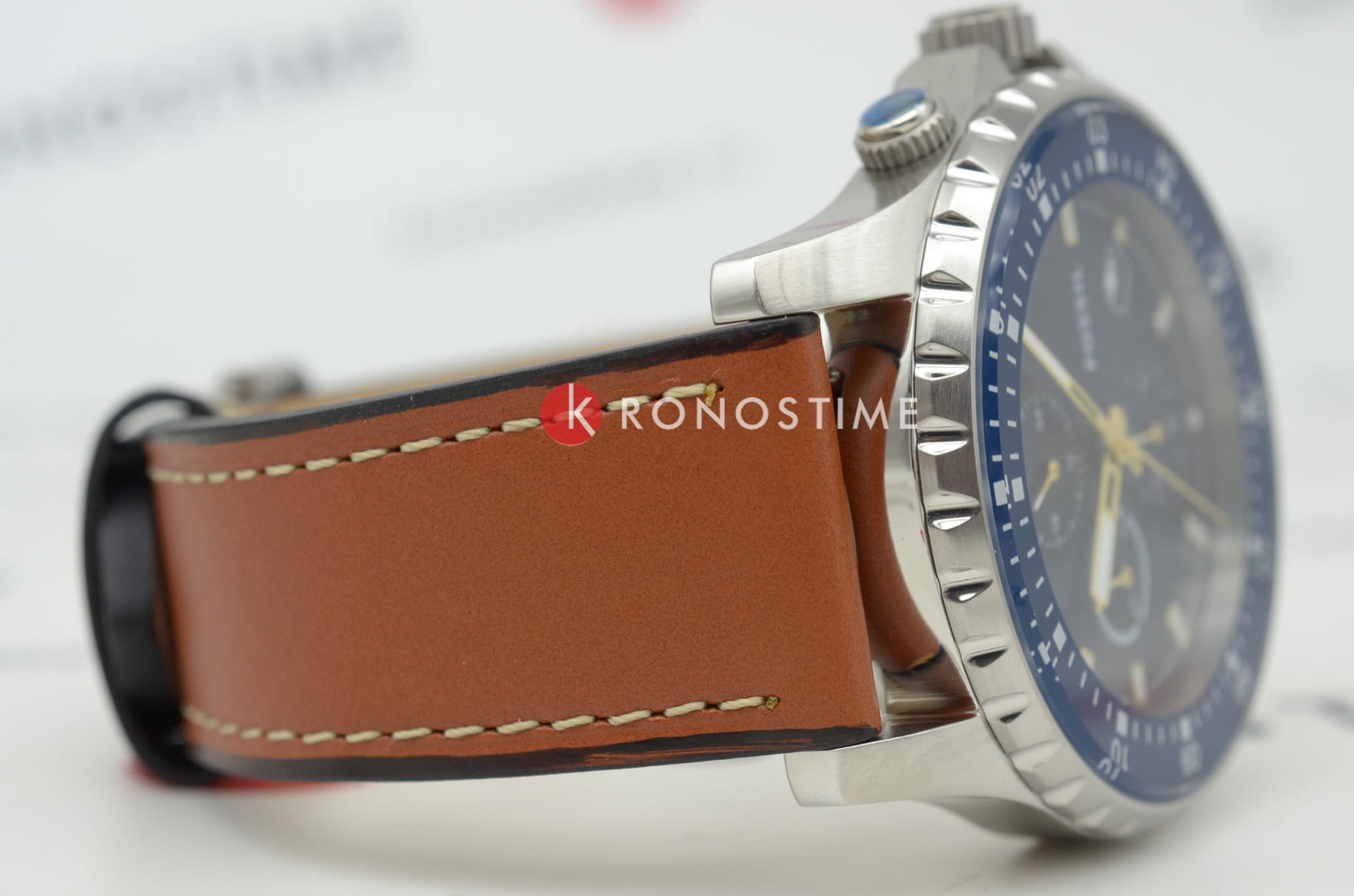 Мужские кварцевые часы Fossil Dillinger FS5675 — это стильный хронографХронографФункция позволяет измерять отрезки времени с особой точностью: часы, минуты, секунды. Верным признаком хронографа является наличие на циферблате 3 дополнительных окошек-счётчиков., сочетающий в себе элегантность и функциональность. Модель выполнена из нержавеющей стали серебристого цвета, диаметром 48 мм, что придаёт ей устойчивость к царапинам и благородный внешний вид. Циферблат защищен минеральным стекломМинеральное стеклоМинеральное стекло представляет собой искусственно выращенный минерал кварца. Такое стекло отличается особой устойчивостью к повреждениям и царапинам. Уступает по некоторым качествам сапфировому стеклу., устойчивым к повреждениям. Стрелки и метки имеют люминесцентное покрытиеЛюминесцентное покрытиеПозволяет считывать показания времени в темноте. Производители наносят на стрелки, часовые индексы, безель или поверхность циферблата светонакопительный состав, дающий холодное свечение., обеспечивающее отличную читаемость даже в условиях слабого освещения. Три дополнительных циферблата, отображение 24-часового формата времени. Окошко даты находится в положении 4 часа. БезельБезельВнешний ободок, закрепляющий стекло. В спортивных часах так называется поворотное кольцо с делениями на циферблате, выполняет роль таймера – замеряет отрезки времени на шкале. Неподвижный безель – элемент декора. Однонаправленно вращающийся безель на дайверских часах позволяет фиксировать моменты погружения и выныривания на поверхность. с PVD-покрытиемPVDУльтратонкое покрытие наносится в технике вакуумного напыления, сочетает в себе нитрид титана особой прочности со слоем золота или оксида хрома. Несёт в себе декоративную или защитную функцию. синего цвета. Часы оснащены кварцевым механизмом, обеспечивающим точную работу и минимальное обслуживание. Водонепроницаемость 50 метров позволит защитить корпус от случайных брызг или капель дождя. Браслет из кожи оснащён стандартной застёжкой, обеспечивающий комфорт и надёжную фиксацию на запястье. Эти часы станут универсальным аксессуаром для тех, кто ценит сочетание стиля, функциональности и надёжности — идеальный выбор для повседневной носки и активного образа жизни.