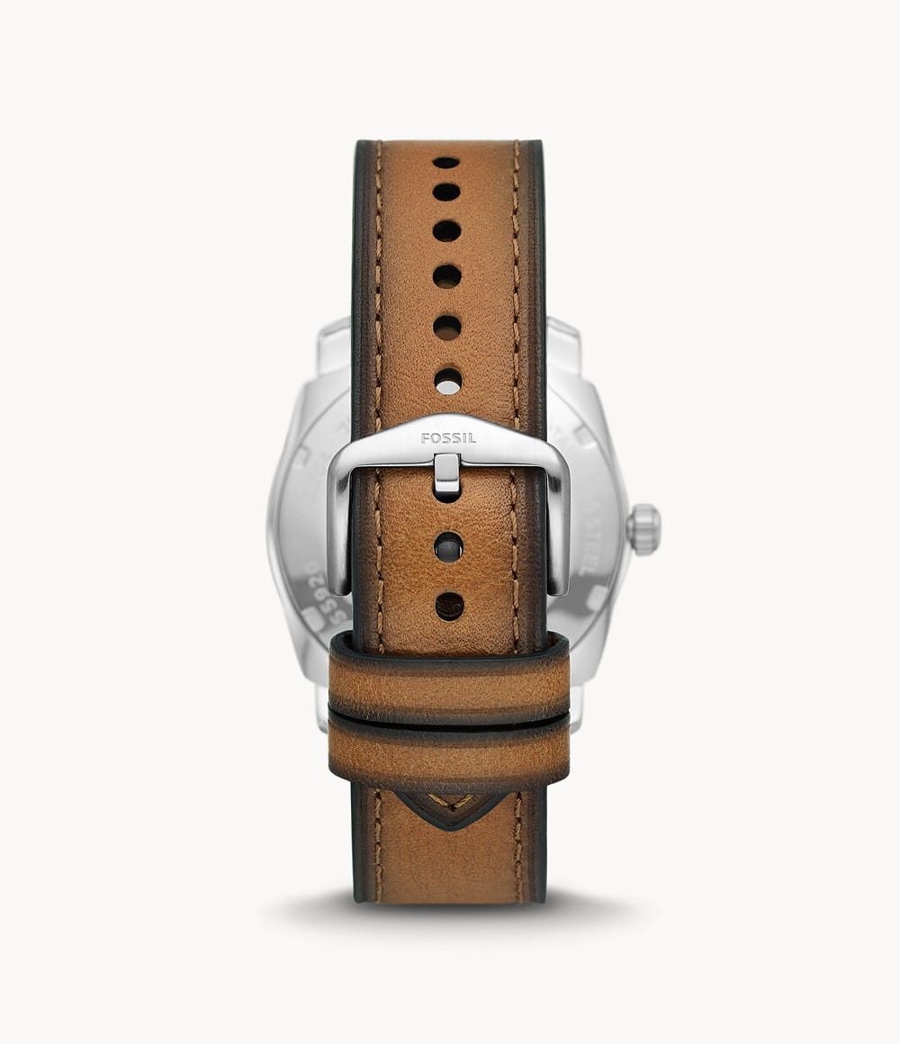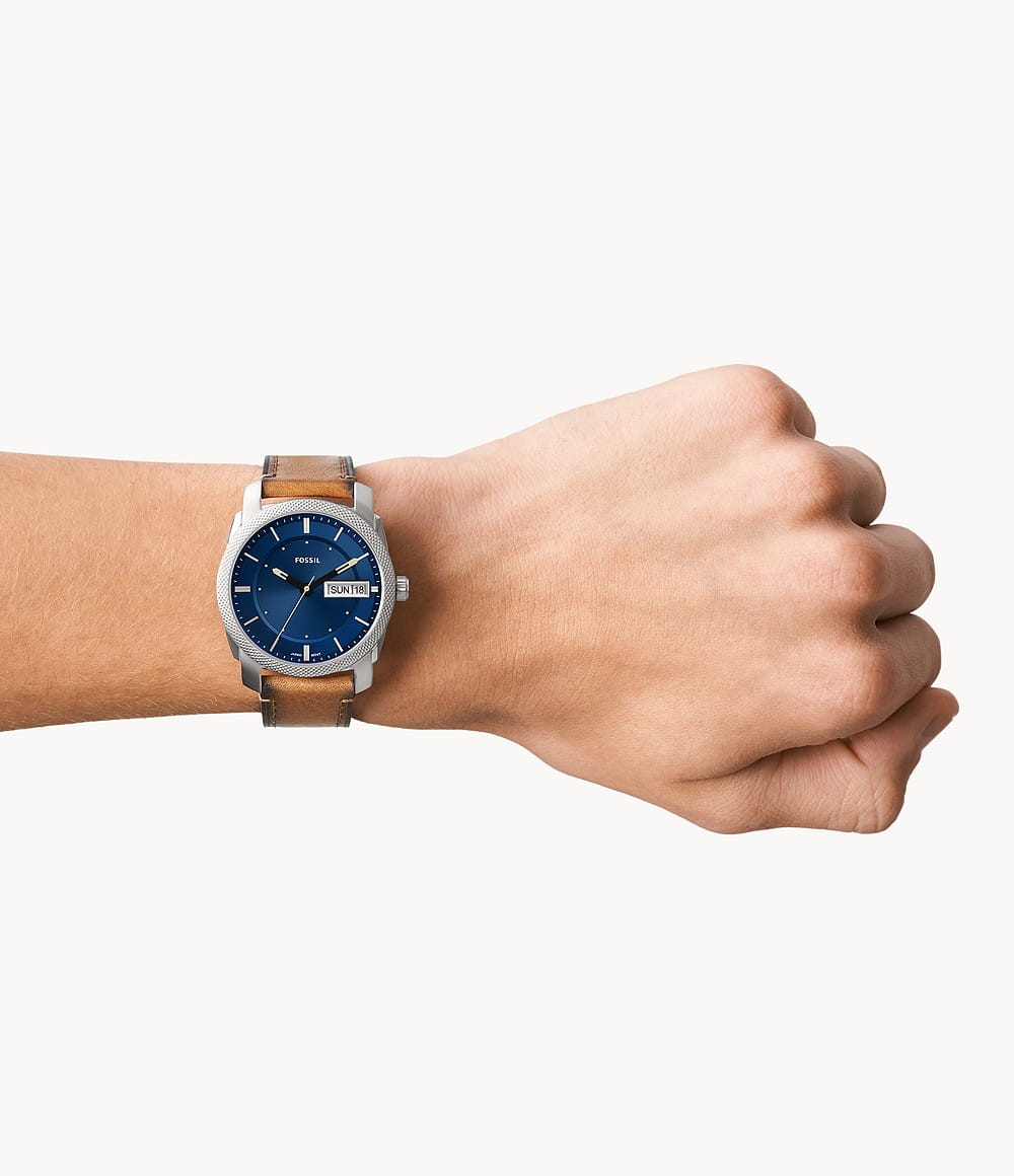Мужские наручные часы Fossil Machine FS5920. Кварцевый механизм с высокой точностью. Минеральное стеклоМинеральное стеклоМинеральное стекло представляет собой искусственно выращенный минерал кварца. Такое стекло отличается особой устойчивостью к повреждениям и царапинам. Уступает по некоторым качествам сапфировому стеклу. устойчивое к появлению царапин, обладающее высокой прозрачностью. Стрелки с люминесцентным покрытиемЛюминесцентное покрытиеПозволяет считывать показания времени в темноте. Производители наносят на стрелки, часовые индексы, безель или поверхность циферблата светонакопительный состав, дающий холодное свечение. Класс водозащиты: 50 метров, позволит защитить корпус от случайных брызг или капель дождя. Корпус часов изготовлен из стали серебристого цвета. Рифленая заводная головка. На циферблате расположены метки в виде штрихов и окошко даты и дня недели в положении 3 часа. Кожаный ремешок с классической застежкой.