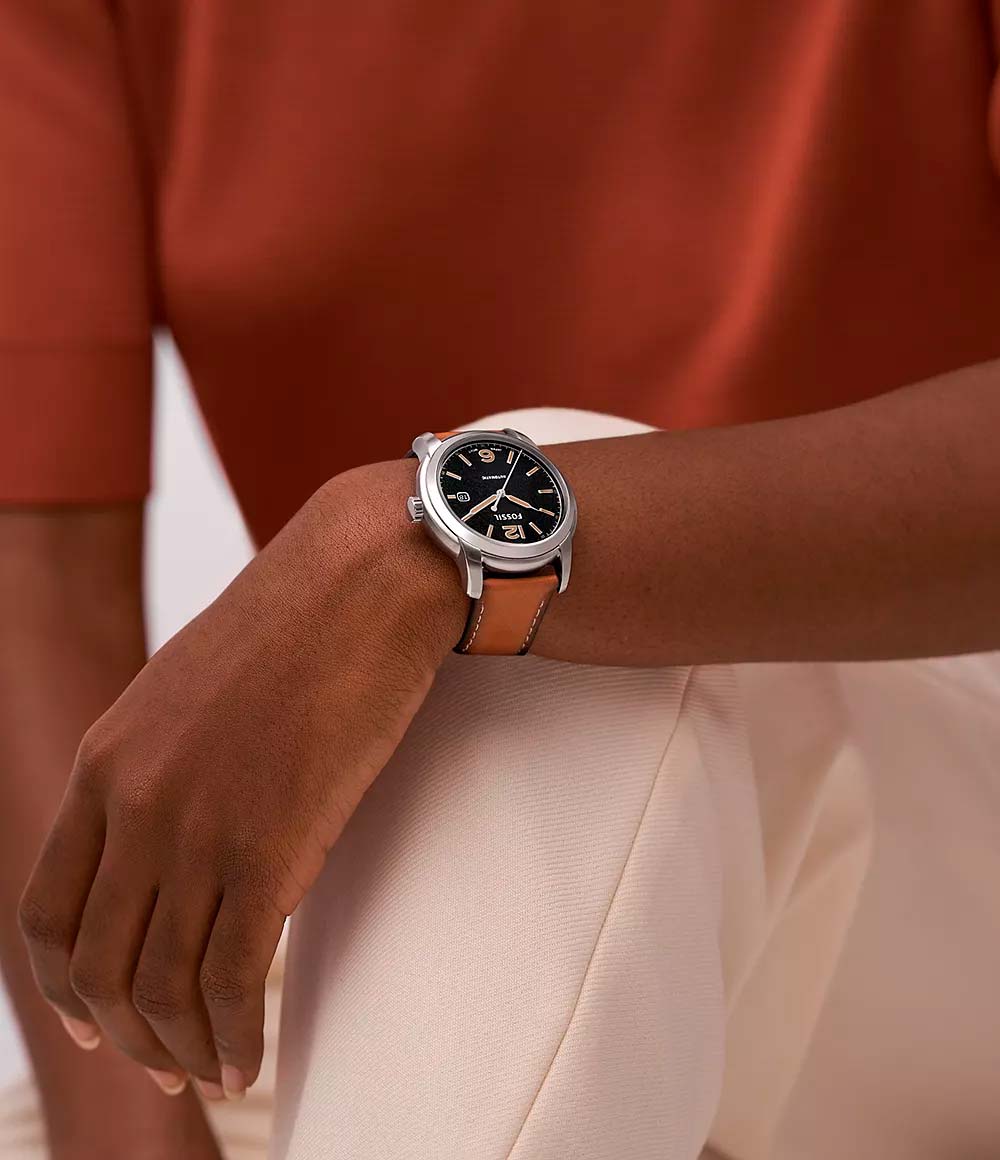 Наручные часы Fossil Heritage ME3233 с надёжным автоматическим механизмом. Корпус часов изготовлен из нержавеющей стали. Минеральное стеклоМинеральное стеклоМинеральное стекло представляет собой искусственно выращенный минерал кварца. Такое стекло отличается особой устойчивостью к повреждениям и царапинам. Уступает по некоторым качествам сапфировому стеклу. устойчивое к мелким механическим повреждениям. Кожаный ремешок на стандартной застёжке. Класс водозащиты: 50 метров, позволит защитить корпус от случайных брызг или капель дождя. Стрелки и метки с люминесцентным покрытиемЛюминесцентное покрытиеПозволяет считывать показания времени в темноте. Производители наносят на стрелки, часовые индексы, безель или поверхность циферблата светонакопительный состав, дающий холодное свечение.. Окошко даты находится в положении 3 часа.