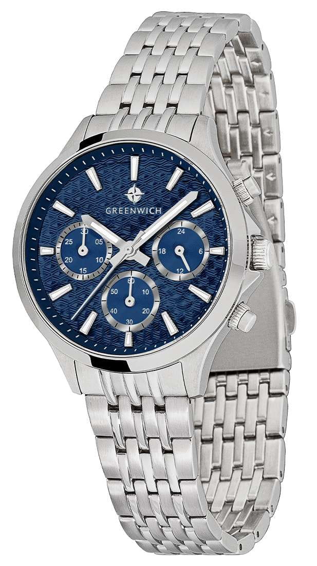 Женские кварцевые часы Greenwich — это сочетание элегантности и функциональности. Корпус диаметром 35 мм выполнен из нержавеющей стали. Циферблат синего цвета оформлен с эффектом гильоше в виде волнообразных линий, придающим ему объём и глубину. На циферблате расположены субциферблаты хронографа (секундомер на 60 секунд и 30 минут) и индикатор 24-часового формата. Окошко даты находится в положении 3 часов. Все индикаторы выделены рамками с зеркальной полировкой. Стрелки и метки с люминесцентным покрытиемЛюминесцентное покрытиеПозволяет считывать показания времени в темноте. Производители наносят на стрелки, часовые индексы, безель или поверхность циферблата светонакопительный состав, дающий холодное свечение., обеспечивающим хорошую читаемость в темноте. Циферблат защищён минеральным стекломМинеральное стеклоМинеральное стекло представляет собой искусственно выращенный минерал кварца. Такое стекло отличается особой устойчивостью к повреждениям и царапинам. Уступает по некоторым качествам сапфировому стеклу.. Механизм — кварцевый калибр Miyota с функцией хронографа. Часы оснащены стальным браслетом с комбинированной полировкой (матовые и зеркальные звенья) и удобной раскладной застёжкойРаскладная застёжкаТакой тип застёжки используется только на браслетах из металла. Она никогда не раскрывается полностью, происходит разделение на 2 и более частей. Раскладывающая застёжка снизит вероятность потери часов к минимуму.. Водонепроницаемость 100 м позволяет использовать часы для плавания и повседневного ношения. Гарантия — 24 месяца. Идеальный выбор для тех, кто ценит стиль, точность и надёжность.