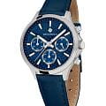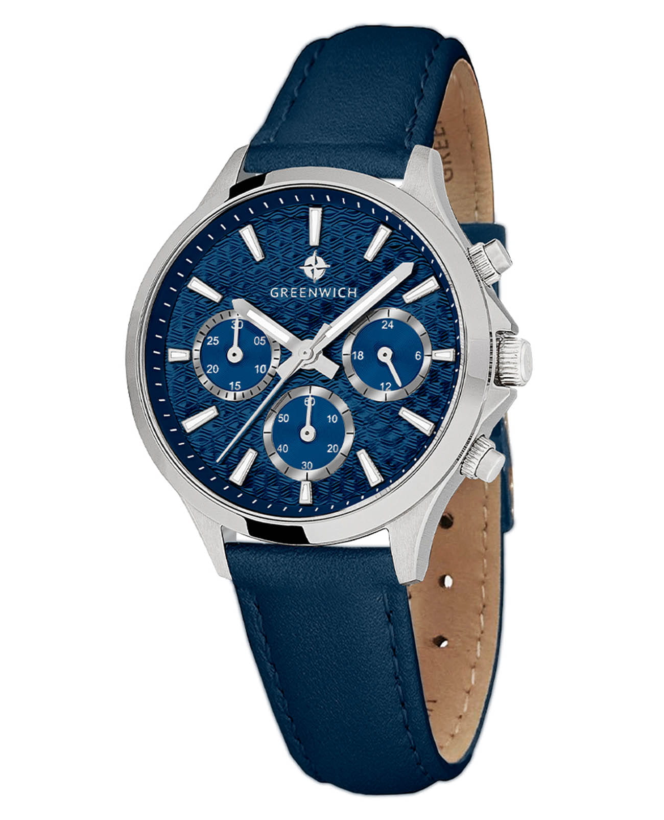 Женские кварцевые часы Greenwich из коллекции Mermaid — это сочетание элегантности и функциональности. Корпус диаметром 35 мм выполнен из нержавеющей стали. Циферблат синего цвета оформлен с эффектом гильоше в виде волнообразных линий, придающим ему объём и глубину. На циферблате расположены субциферблаты хронографа (секундомер на 60 секунд и 30 минут) и индикатор 24-часового формата. Все индикаторы выделены рамками с зеркальной полировкой. Стрелки и метки с люминесцентным покрытиемЛюминесцентное покрытиеПозволяет считывать показания времени в темноте. Производители наносят на стрелки, часовые индексы, безель или поверхность циферблата светонакопительный состав, дающий холодное свечение., обеспечивающим хорошую читаемость в темноте. Циферблат защищён минеральным стекломМинеральное стеклоМинеральное стекло представляет собой искусственно выращенный минерал кварца. Такое стекло отличается особой устойчивостью к повреждениям и царапинам. Уступает по некоторым качествам сапфировому стеклу.. Механизм — кварцевый калибр Miyota с функцией хронографа. Часы оснащены кожаным ремешком синего цвета с классической пряжкой из нержавеющей стали. Водонепроницаемость 100 м позволяет использовать часы для плавания и повседневного ношения. Гарантия — 24 месяца. Идеальный выбор для тех, кто ценит стиль, точность и надёжность.