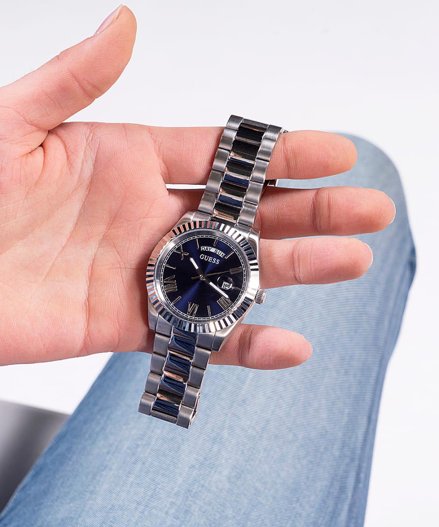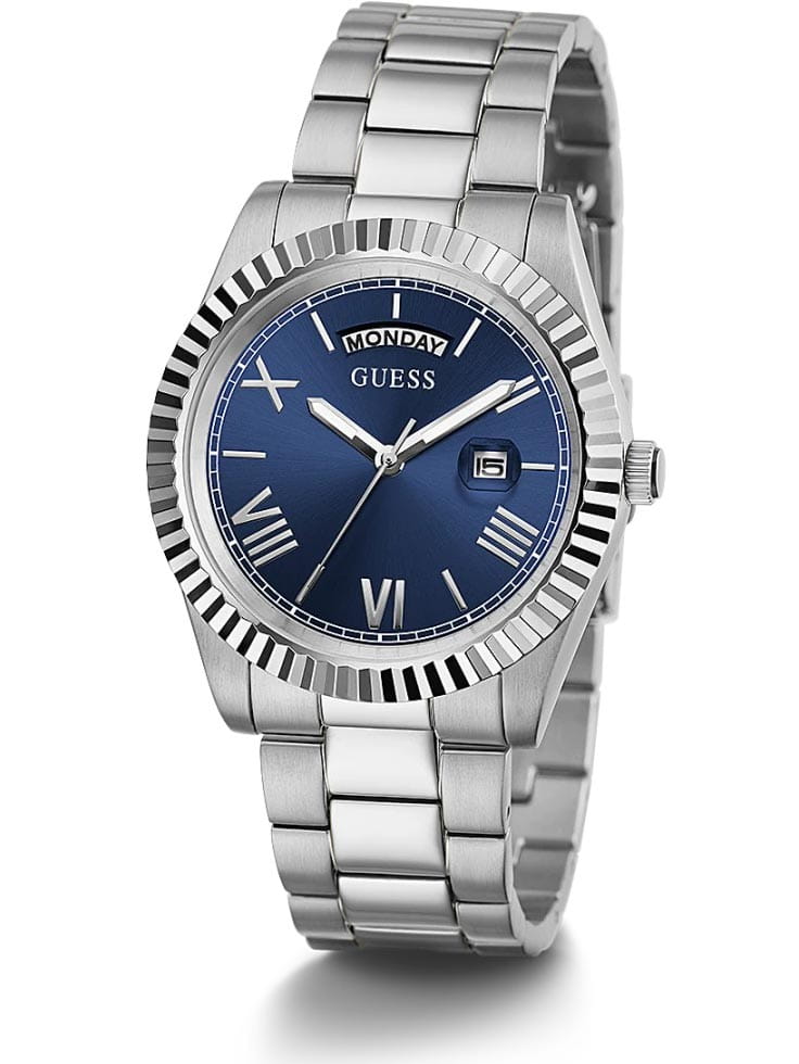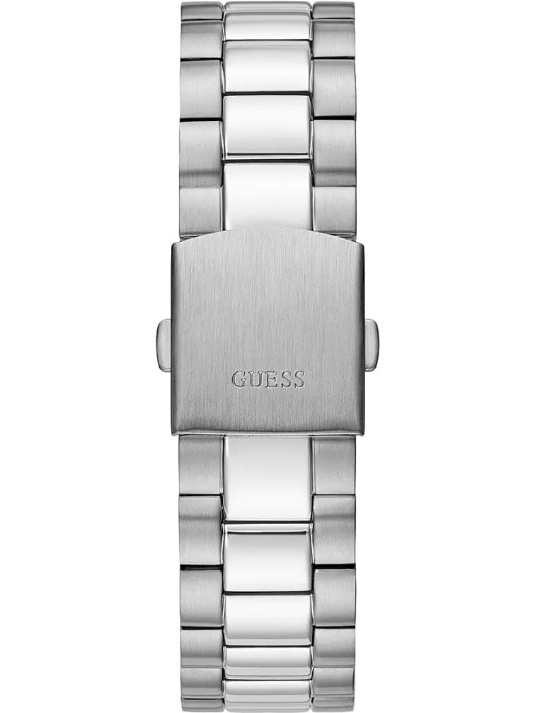 Мужские наручные часы в стиле fashion Guess GW0265G7 с минеральным стекломМинеральное стеклоМинеральное стекло представляет собой искусственно выращенный минерал кварца. Такое стекло отличается особой устойчивостью к повреждениям и царапинам. Уступает по некоторым качествам сапфировому стеклу., кварцевый механизм с высокой точностью. Класс водозащиты: 50 метров, позволит защитить корпус от случайных брызг или капель дождя. Корпус часов изготовлен из стали. Циферблат выполнен по технологии Sunray (солнечные лучи). Метки в виде штрихов и римских цифр. Окошко даты с увеличительным стеклом. День недели отображается в положении 12 часов. Браслет с раскладной застёжкойРаскладная застёжкаТакой тип застёжки используется только на браслетах из металла. Она никогда не раскрывается полностью, происходит разделение на 2 и более частей. Раскладывающая застёжка снизит вероятность потери часов к минимуму.