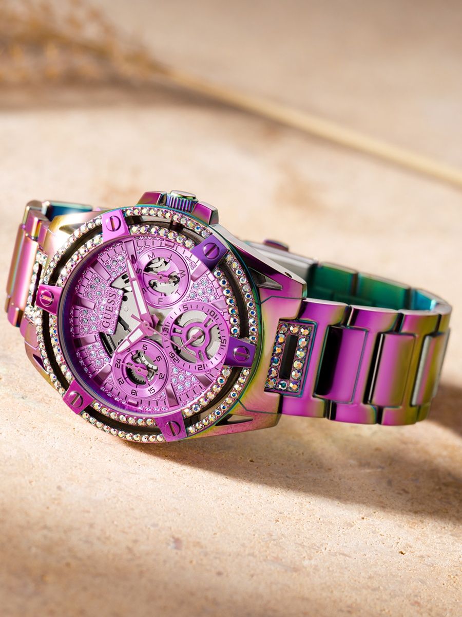 Женские наручные часы-скелетоны Guess Queen GW0464L4 с минеральным стекломМинеральное стеклоМинеральное стекло представляет собой искусственно выращенный минерал кварца. Такое стекло отличается особой устойчивостью к повреждениям и царапинам. Уступает по некоторым качествам сапфировому стеклу., кварцевый механизм с высокой точностью. Класс водозащиты: 30 метров, позволит защитить корпус от случайных брызг или капель дождя. Корпус часов изготовлен из стали с IP-покрытиемIP-покрытиеМетод ионного напыления. Демонстрирует повышенную устойчивость к истиранию, окислению и химическим веществам. Под воздействием высокого давления и температуры около 1500°C молекулы металла надёжно соединяются с частицами корпуса часов.. Браслет с раскладной застёжкойРаскладная застёжкаТакой тип застёжки используется только на браслетах из металла. Она никогда не раскрывается полностью, происходит разделение на 2 и более частей. Раскладывающая застёжка снизит вероятность потери часов к минимуму. с IP-покрытиемIP-покрытиеМетод ионного напыления. Демонстрирует повышенную устойчивость к истиранию, окислению и химическим веществам. Под воздействием высокого давления и температуры около 1500°C молекулы металла надёжно соединяются с частицами корпуса часов.. 12-ти и 24-х часовой формат времени, дата и день недели вынесены на отдельные циферблаты. Метки в виде штрихов. Рифленая заводная головка с защитой. Стрелки с люминесцентным покрытиемЛюминесцентное покрытиеПозволяет считывать показания времени в темноте. Производители наносят на стрелки, часовые индексы, безель или поверхность циферблата светонакопительный состав, дающий холодное свечение..