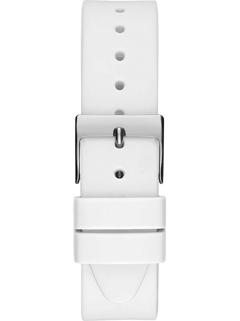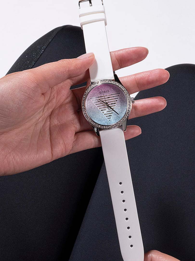 Женские наручные часы с минеральным стекломМинеральное стеклоМинеральное стекло представляет собой искусственно выращенный минерал кварца. Такое стекло отличается особой устойчивостью к повреждениям и царапинам. Уступает по некоторым качествам сапфировому стеклу. Guess Lady Idol GW0530L5, кварцевый механизм с высокой точностью. Класс водозащиты: 30 метров, позволит защитить корпус от случайных брызг или капель дождя. Корпус часов изготовлен из стали. Силиконовый ремешок на стандартной застёжке. Радужный циферблат. Рифленая заводная головка.