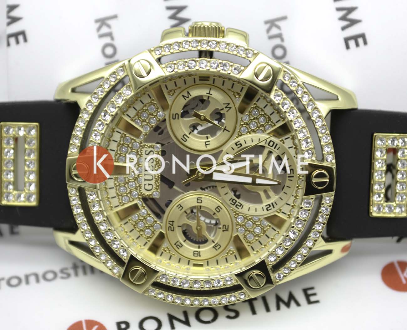 Женские наручные часы-скелетоны с минеральным стекломМинеральное стеклоМинеральное стекло представляет собой искусственно выращенный минерал кварца. Такое стекло отличается особой устойчивостью к повреждениям и царапинам. Уступает по некоторым качествам сапфировому стеклу. Guess Queen GW0536L3, кварцевый механизм с высокой точностью. Класс водозащиты: 30 метров, позволит защитить корпус от случайных брызг или капель дождя. Корпус часов изготовлен из стали с IP-покрытиемIP-покрытиеМетод ионного напыления. Демонстрирует повышенную устойчивость к истиранию, окислению и химическим веществам. Под воздействием высокого давления и температуры около 1500°C молекулы металла надёжно соединяются с частицами корпуса часов.. Силиконовый ремешок на стандартной застёжке. 24-х часовой формат времени, дата и день недели вынесены на отдельные циферблаты. Метки в виде штрихов. Рифленая заводная головка с защитой. Циферблат и ремешок украшены кристаллами.