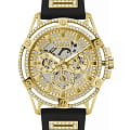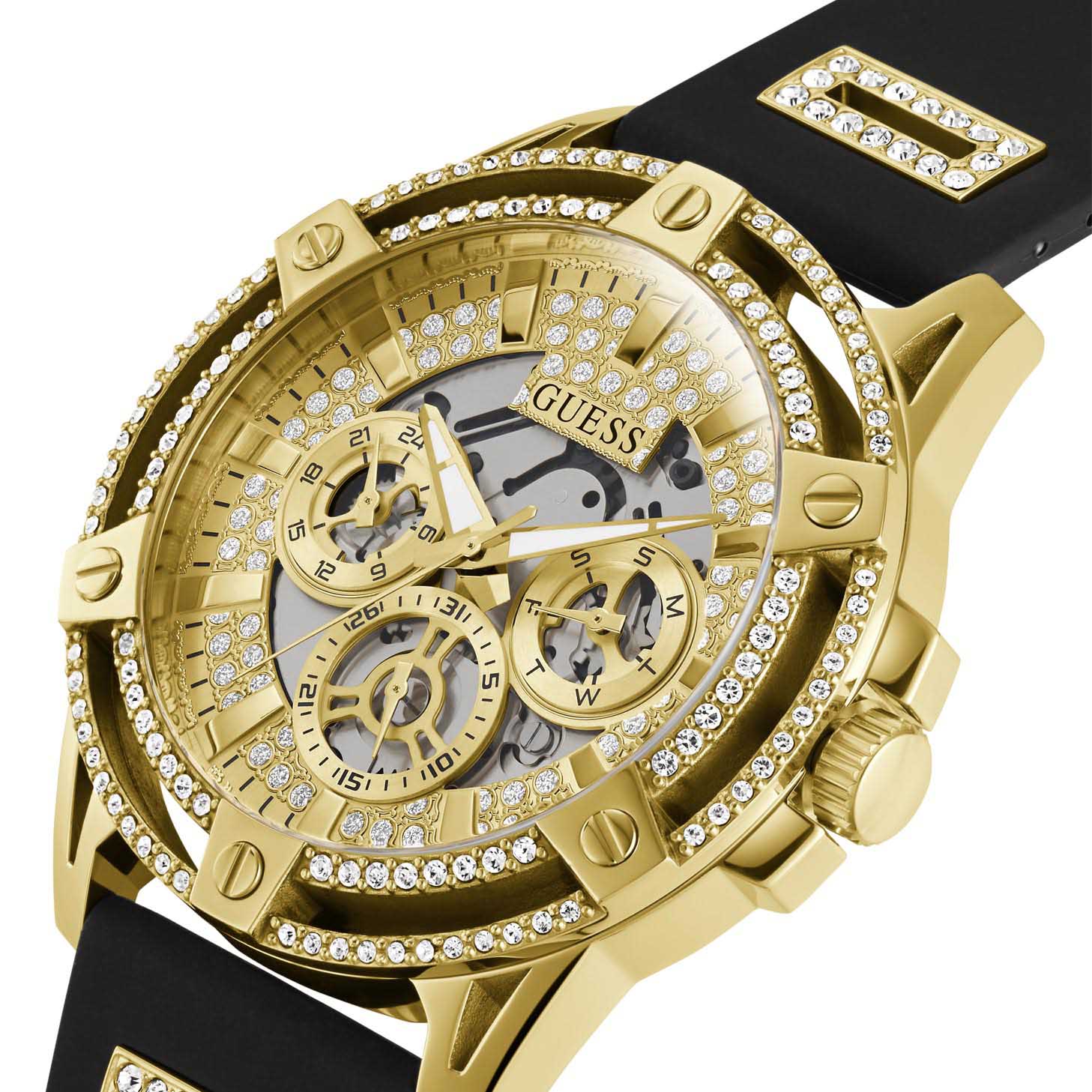 Мужские наручные часы Guess GW0534L2 с минеральным стекломМинеральное стеклоМинеральное стекло представляет собой искусственно выращенный минерал кварца. Такое стекло отличается особой устойчивостью к повреждениям и царапинам. Уступает по некоторым качествам сапфировому стеклу., кварцевый механизм с высокой точностью. Класс водозащиты: 50 метров, позволит защитить корпус от случайных брызг или капель дождя. Стрелки с люминесцентным покрытиемЛюминесцентное покрытиеПозволяет считывать показания времени в темноте. Производители наносят на стрелки, часовые индексы, безель или поверхность циферблата светонакопительный состав, дающий холодное свечение.. Корпус часов изготовлен из стали с IP-покрытиемIP-покрытиеМетод ионного напыления. Демонстрирует повышенную устойчивость к истиранию, окислению и химическим веществам. Под воздействием высокого давления и температуры около 1500°C молекулы металла надёжно соединяются с частицами корпуса часов.. Браслет с ювелирной застежкой. Корпус и циферблат украшены кристаллами.