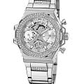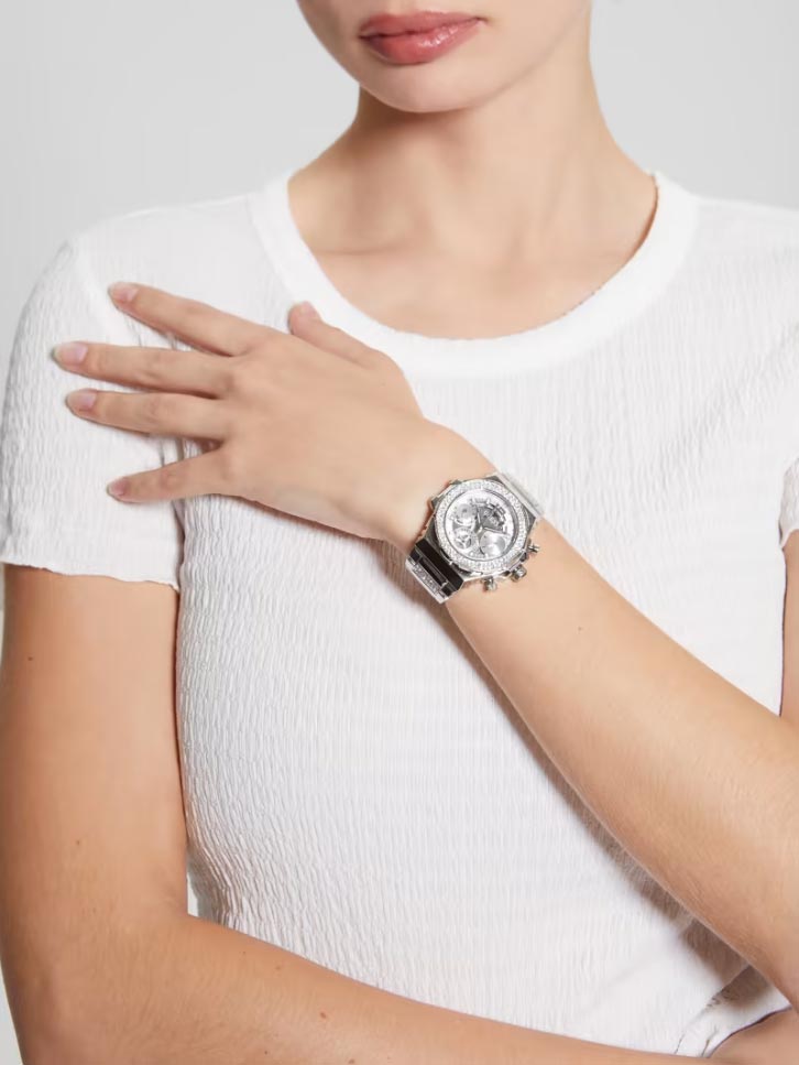 Женские наручные часы Guess Sport Steel GW0552L1 с минеральным стекломМинеральное стеклоМинеральное стекло представляет собой искусственно выращенный минерал кварца. Такое стекло отличается особой устойчивостью к повреждениям и царапинам. Уступает по некоторым качествам сапфировому стеклу., кварцевый механизм с высокой точностью. 24-х часовой формат времени, число и день недели отображаются на отдельных циферблатах. Стрелки и метки с люминесцентным покрытиемЛюминесцентное покрытиеПозволяет считывать показания времени в темноте. Производители наносят на стрелки, часовые индексы, безель или поверхность циферблата светонакопительный состав, дающий холодное свечение.. Класс водозащиты: 50 метров, позволит защитить корпус от случайных брызг или капель дождя. Корпус часов изготовлен из стали. БезельБезельВнешний ободок, закрепляющий стекло. В спортивных часах так называется поворотное кольцо с делениями на циферблате, выполняет роль таймера – замеряет отрезки времени на шкале. Неподвижный безель – элемент декора. Однонаправленно вращающийся безель на дайверских часах позволяет фиксировать моменты погружения и выныривания на поверхность. инкрустирован кристаллами. Браслет с раскладной застёжкойРаскладная застёжкаТакой тип застёжки используется только на браслетах из металла. Она никогда не раскрывается полностью, происходит разделение на 2 и более частей. Раскладывающая застёжка снизит вероятность потери часов к минимуму..