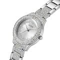 Женские наручные часы с минеральным стекломМинеральное стеклоМинеральное стекло представляет собой искусственно выращенный минерал кварца. Такое стекло отличается особой устойчивостью к повреждениям и царапинам. Уступает по некоторым качествам сапфировому стеклу. Guess Trend GW0746L1, кварцевый механизм с высокой точностью. Корпус часов изготовлен из стали. БезельБезельВнешний ободок, закрепляющий стекло. В спортивных часах так называется поворотное кольцо с делениями на циферблате, выполняет роль таймера – замеряет отрезки времени на шкале. Неподвижный безель – элемент декора. Однонаправленно вращающийся безель на дайверских часах позволяет фиксировать моменты погружения и выныривания на поверхность.,  корпус и циферблат украшены кристаллами. Класс водозащиты: 30 метров, позволит защитить корпус от случайных брызг или капель дождя. Стальной браслет на раскладной застёжкеРаскладная застёжкаТакой тип застёжки используется только на браслетах из металла. Она никогда не раскрывается полностью, происходит разделение на 2 и более частей. Раскладывающая застёжка снизит вероятность потери часов к минимуму..