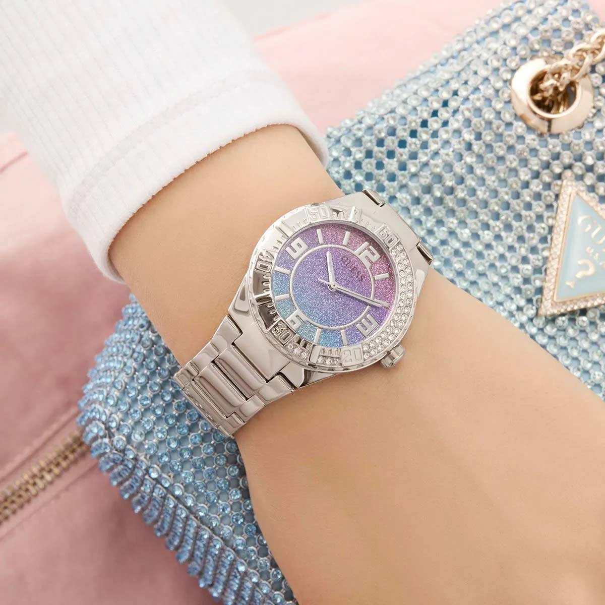 Изысканные женские наручные часы Guess GW0882L1 станут великолепным украшением вашего запястья. Эти часы оснащены надежным кварцевым механизмом, что обеспечивает их точность и долговечность. Круглый корпус выполнен из прочной стали и украшен рифленым безелемБезельВнешний ободок, закрепляющий стекло. В спортивных часах так называется поворотное кольцо с делениями на циферблате, выполняет роль таймера – замеряет отрезки времени на шкале. Неподвижный безель – элемент декора. Однонаправленно вращающийся безель на дайверских часах позволяет фиксировать моменты погружения и выныривания на поверхность. с кристаллами, придающими часам особый блеск и очарование. Циферблат привлекает внимание своим ярким фиолетовым и синим оттенком, дополненным кристаллами, что создает впечатляющий визуальный эффект. Метки в виде штрихов и арабских цифр делают чтение времени легким и удобным. Рифленая заводная головка добавляет изделию функциональности и эстетической завершенности. Часы оснащены стальным браслетом с раскладной застежкойРаскладная застёжкаТакой тип застёжки используется только на браслетах из металла. Она никогда не раскрывается полностью, происходит разделение на 2 и более частей. Раскладывающая застёжка снизит вероятность потери часов к минимуму., который обеспечивает комфортное и надежное прилегание к запястью. Минеральное стеклоМинеральное стеклоМинеральное стекло представляет собой искусственно выращенный минерал кварца. Такое стекло отличается особой устойчивостью к повреждениям и царапинам. Уступает по некоторым качествам сапфировому стеклу. защищает циферблат от царапин и других повреждений, сохраняя его безупречный вид. Люминесцентное покрытиеЛюминесцентное покрытиеПозволяет считывать показания времени в темноте. Производители наносят на стрелки, часовые индексы, безель или поверхность циферблата светонакопительный состав, дающий холодное свечение. на стрелках обеспечивает отличную видимость в темноте.