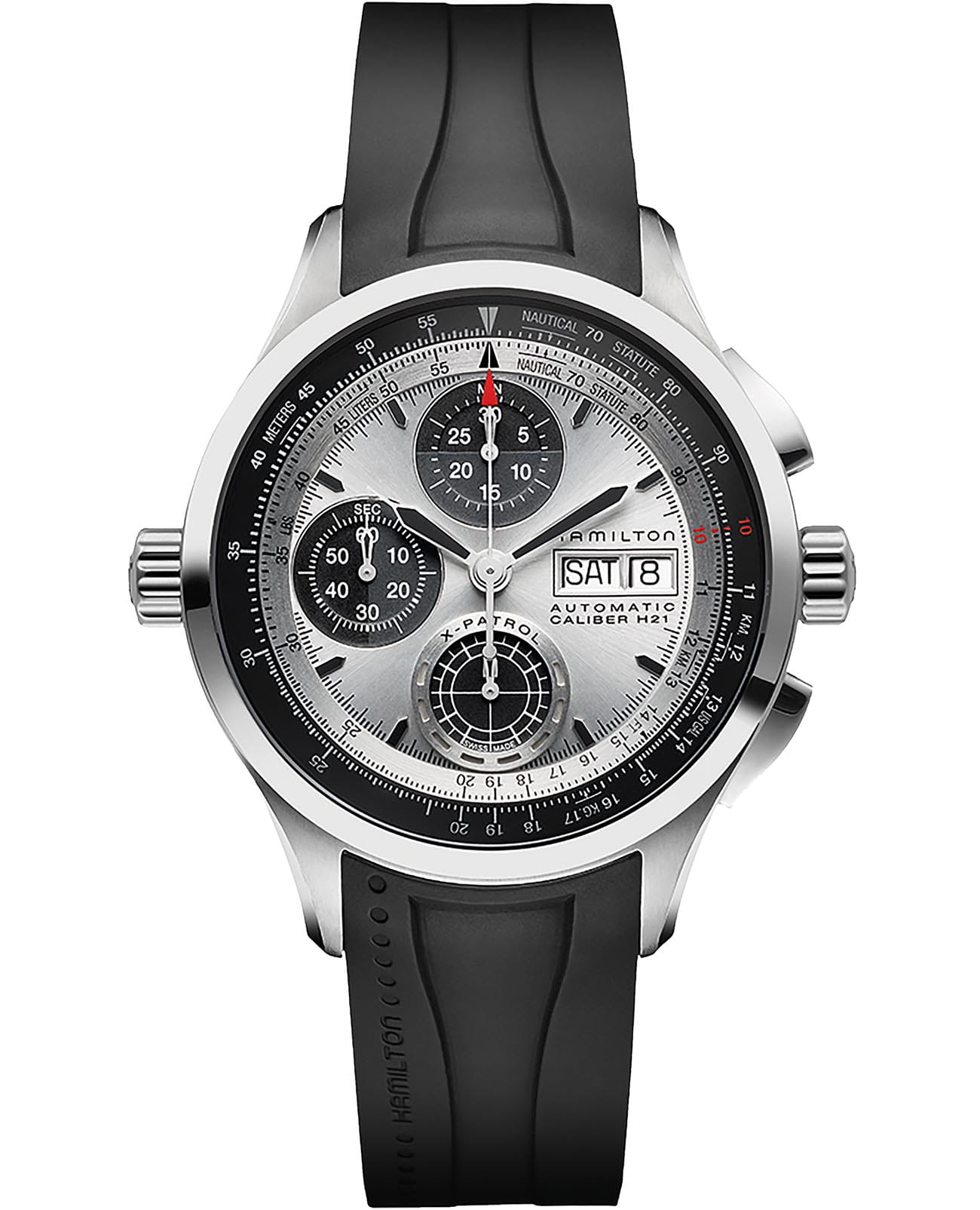 Мужские механические швейцарские часы-хронографХронографФункция позволяет измерять отрезки времени с особой точностью: часы, минуты, секунды. Верным признаком хронографа является наличие на циферблате 3 дополнительных окошек-счётчиков. с автоподзаводом Hamilton Khaki Aviation X-Patrol Auto Chrono H76566351. Корпус часов изготовлен из нержавеющей стали. Сапфировое стеклоСапфировое стеклоПрочный и надёжный материал из кристалла сапфира синтетического происхождения, характеризующийся особой твёрдостью и устойчивостью к царапинам и повреждениям. устойчивое к мелким механическим повреждениям. Стрелки и метки с люминесцентным покрытиемЛюминесцентное покрытиеПозволяет считывать показания времени в темноте. Производители наносят на стрелки, часовые индексы, безель или поверхность циферблата светонакопительный состав, дающий холодное свечение.. Класс водозащиты: 100 метров, позволит плавать, нырять и заниматься другими водными видами спорта. Каучуковый ремешок на застёжке-бабочке с кнопкамиЗастёжка "бабочка"Такой вид застёжки дополняется предохранителями, помогающими избежать случайного раскрытия браслета. Обладают изящным исполнением. . Окошки дня недели и даты находятся в положении 3 часа.