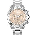 Элегантные женские часы Hugo Boss HB1502615 из коллекции Novia Sport Lux представлены в стальном корпусе диаметром 38 мм с эффектным розовым цифербалтом в технике Sunray, защищённым прочным минеральным стекломМинеральное стеклоМинеральное стекло представляет собой искусственно выращенный минерал кварца. Такое стекло отличается особой устойчивостью к повреждениям и царапинам. Уступает по некоторым качествам сапфировому стеклу.. Модель оснащена швейцарским кварцевым механизмом с полезными функциями: индикацией даты между 4 и 5 часами, вторым часовым поясомВторой часовой поясФункция, позволяющая отображать время двух часовых поясов одновременно. в 24-часовом формате и тахиметрической шкалойТахиметрРазмеченная шкала, располагается на ободке или безеле часов. Тахиметр позволяет рассчитать скорость на определённом участке пути, расстояние измеряется в километрах или милях.. Спортивный характер подчёркивает рифлёная заводная головка с защитой, а стальной браслет с раскладывающейся застёжкой обеспечивает комфортную посадку. Ударопрочная конструкцияУдаропрочный корпусМеханизм заключён в корпус, выполненный из современных материалов, устойчивых к ударам, механическим повреждениям и падению с высоты: инновационный пластик, карбон, нержавеющая сталь, титан. с водонепроницаемостью 50 метров делает часы устойчивыми к повседневным нагрузкам.