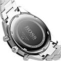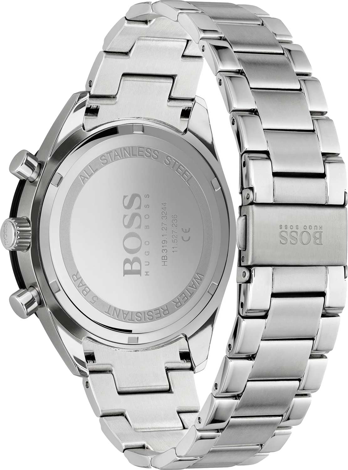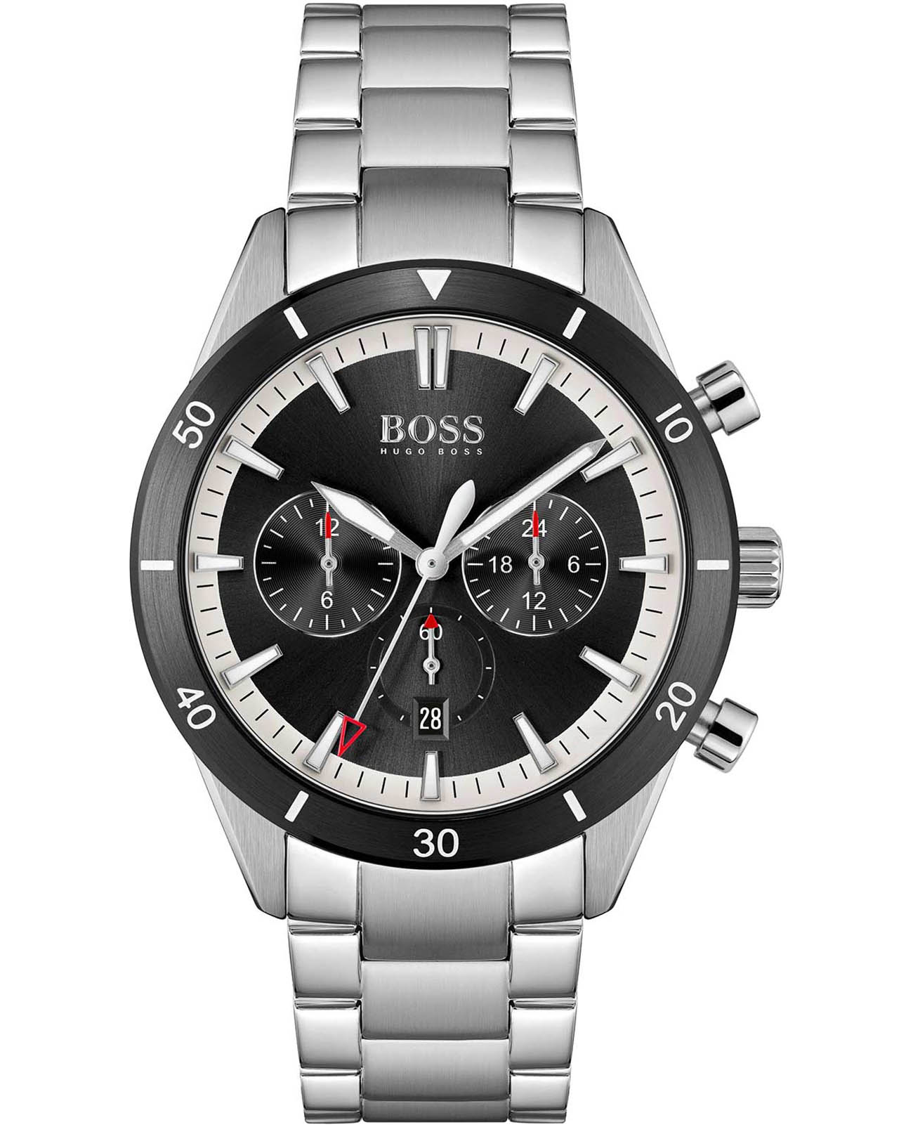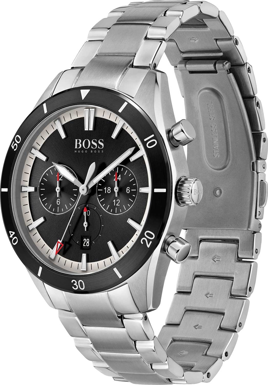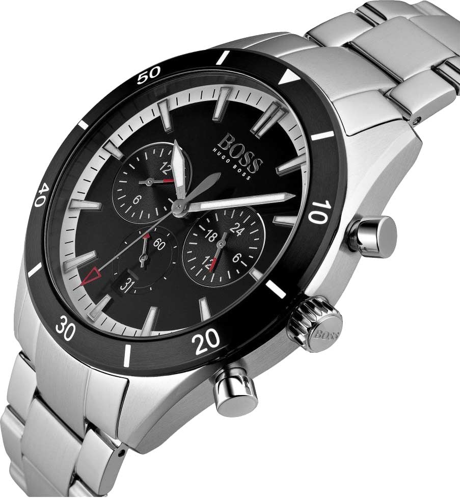 Мужские часы Hugo Boss HB1513862 коллекции Santiago представлены в круглом 44-мм корпусе из нержавеющей стали 316L с IP-покрытиемIP-покрытиеМетод ионного напыления. Демонстрирует повышенную устойчивость к истиранию, окислению и химическим веществам. Под воздействием высокого давления и температуры около 1500°C молекулы металла надёжно соединяются с частицами корпуса часов.. Оснащены кварцевым механизмом с функциями хронографаХронографФункция позволяет измерять отрезки времени с особой точностью: часы, минуты, секунды. Верным признаком хронографа является наличие на циферблате 3 дополнительных окошек-счётчиков., секундомеромСекундомерСекундоме́р — прибор, способный измерять интервалы времени с точностью до долей секунды. и тахиметрической шкалойТахиметрРазмеченная шкала, располагается на ободке или безеле часов. Тахиметр позволяет рассчитать скорость на определённом участке пути, расстояние измеряется в километрах или милях., а также индикацией даты. Черный циферблат с метками в виде штрихов защищен устойчивым к царапинам минеральным стекломМинеральное стеклоМинеральное стекло представляет собой искусственно выращенный минерал кварца. Такое стекло отличается особой устойчивостью к повреждениям и царапинам. Уступает по некоторым качествам сапфировому стеклу.. Браслет из стали 316L дополнен раскладной застёжкойРаскладная застёжкаТакой тип застёжки используется только на браслетах из металла. Она никогда не раскрывается полностью, происходит разделение на 2 и более частей. Раскладывающая застёжка снизит вероятность потери часов к минимуму.. Водонепроницаемость 50 метров (5 ATM) обеспечивает защиту от брызг и дождя.