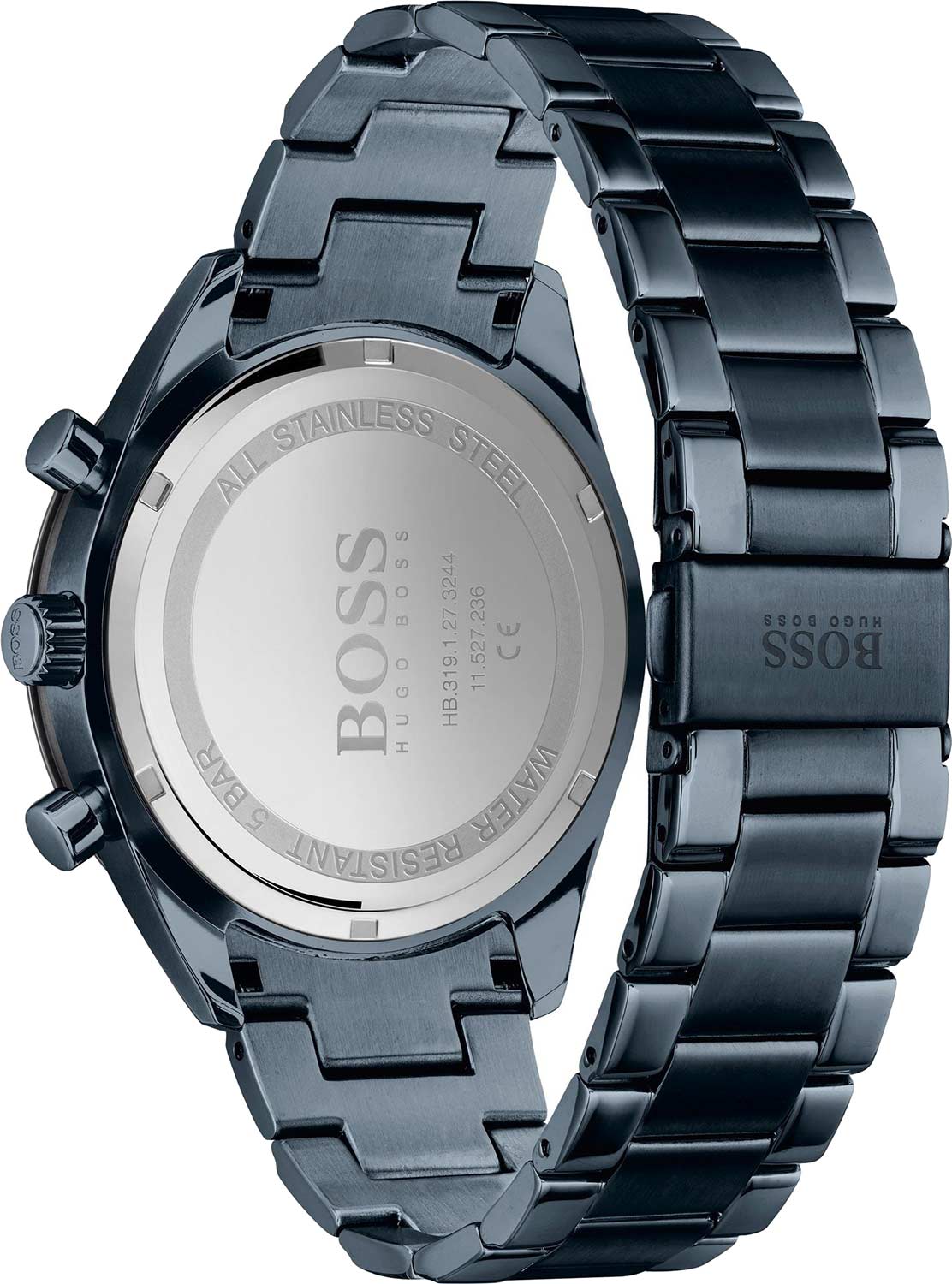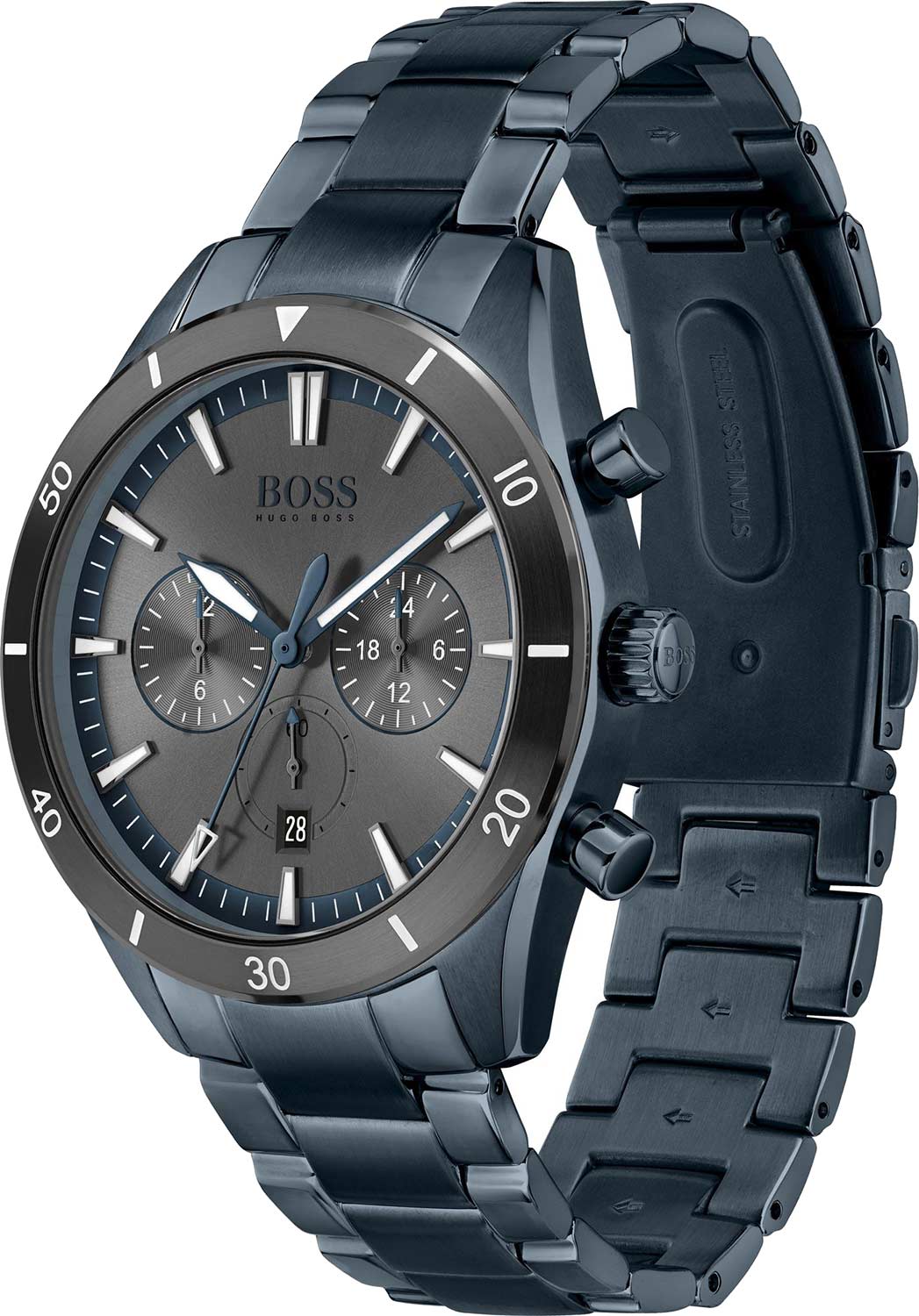 Мужские часы Hugo Boss Santiago HB1513865 представлены в круглом 44-мм корпусе из нержавеющей стали с IP-покрытиемIP-покрытиеМетод ионного напыления. Демонстрирует повышенную устойчивость к истиранию, окислению и химическим веществам. Под воздействием высокого давления и температуры около 1500°C молекулы металла надёжно соединяются с частицами корпуса часов.. Модель оснащена кварцевым механизмом с функциями хронографаХронографФункция позволяет измерять отрезки времени с особой точностью: часы, минуты, секунды. Верным признаком хронографа является наличие на циферблате 3 дополнительных окошек-счётчиков., секундомеромСекундомерСекундоме́р — прибор, способный измерять интервалы времени с точностью до долей секунды. и тахиметромТахиметрРазмеченная шкала, располагается на ободке или безеле часов. Тахиметр позволяет рассчитать скорость на определённом участке пути, расстояние измеряется в километрах или милях., окошком даты на позиции 6 часов и 24-часовым индикатором времени суток. Циферблат с технологией Sunray (эффект солнечных лучей) и арабскими цифрами защищен устойчивым к царапинам минеральным стекломМинеральное стеклоМинеральное стекло представляет собой искусственно выращенный минерал кварца. Такое стекло отличается особой устойчивостью к повреждениям и царапинам. Уступает по некоторым качествам сапфировому стеклу., стрелки и метки покрыты люминесцентным составомЛюминесцентное покрытиеПозволяет считывать показания времени в темноте. Производители наносят на стрелки, часовые индексы, безель или поверхность циферблата светонакопительный состав, дающий холодное свечение. для видимости в темноте. Стальной браслет с IP-покрытиемIP-покрытиеМетод ионного напыления. Демонстрирует повышенную устойчивость к истиранию, окислению и химическим веществам. Под воздействием высокого давления и температуры около 1500°C молекулы металла надёжно соединяются с частицами корпуса часов. дополнен раскладной застёжкойРаскладная застёжкаТакой тип застёжки используется только на браслетах из металла. Она никогда не раскрывается полностью, происходит разделение на 2 и более частей. Раскладывающая застёжка снизит вероятность потери часов к минимуму.. Водонепроницаемость 50 метров (5 ATM) обеспечивает защиту от брызг и дождя