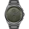 Мужские часы Hugo Boss Steer HB1514045 представлены в круглом 45,8-мм корпусе из нержавеющей стали с IP-покрытиемIP-покрытиеМетод ионного напыления. Демонстрирует повышенную устойчивость к истиранию, окислению и химическим веществам. Под воздействием высокого давления и температуры около 1500°C молекулы металла надёжно соединяются с частицами корпуса часов.. Оснащены кварцевым механизмом с функциями хронографаХронографФункция позволяет измерять отрезки времени с особой точностью: часы, минуты, секунды. Верным признаком хронографа является наличие на циферблате 3 дополнительных окошек-счётчиков., секундомеромСекундомерСекундоме́р — прибор, способный измерять интервалы времени с точностью до долей секунды.. Зеленый циферблат защищен устойчивым к царапинам минеральным стекломМинеральное стеклоМинеральное стекло представляет собой искусственно выращенный минерал кварца. Такое стекло отличается особой устойчивостью к повреждениям и царапинам. Уступает по некоторым качествам сапфировому стеклу.. Браслет из нержавеющей стали с IP-покрытиемIP-покрытиеМетод ионного напыления. Демонстрирует повышенную устойчивость к истиранию, окислению и химическим веществам. Под воздействием высокого давления и температуры около 1500°C молекулы металла надёжно соединяются с частицами корпуса часов. дополнен раскладной застёжкойРаскладная застёжкаТакой тип застёжки используется только на браслетах из металла. Она никогда не раскрывается полностью, происходит разделение на 2 и более частей. Раскладывающая застёжка снизит вероятность потери часов к минимуму.. Водонепроницаемость 50 метров (5 ATM) позволяет использовать часы для плавания.