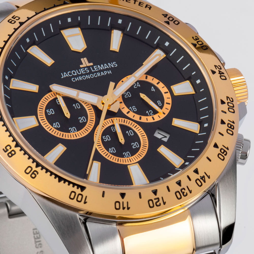 Кварцевый хронографХронографФункция позволяет измерять отрезки времени с особой точностью: часы, минуты, секунды. Верным признаком хронографа является наличие на циферблате 3 дополнительных окошек-счётчиков. в мощном корпусе диаметром 48 мм. Нержавеющая сталь с PVD-покрытиемPVDУльтратонкое покрытие наносится в технике вакуумного напыления, сочетает в себе нитрид титана особой прочности со слоем золота или оксида хрома. Несёт в себе декоративную или защитную функцию., из которой он сделан, отличается гипоаллергенными свойствами и стойкостью к коррозии. Широкий контрастный безельБезельВнешний ободок, закрепляющий стекло. В спортивных часах так называется поворотное кольцо с делениями на циферблате, выполняет роль таймера – замеряет отрезки времени на шкале. Неподвижный безель – элемент декора. Однонаправленно вращающийся безель на дайверских часах позволяет фиксировать моменты погружения и выныривания на поверхность. с тахиметрической шкалой обрамляет зеленый циферблат. На нем расположены три дополнительных индикатора и окошко даты. С помощью индикаторов можно засекать временные промежутки (секунды и минуты) и определять время в 24-часовом формате времяисчисления. В модели установлено минеральное стеклоМинеральное стеклоМинеральное стекло представляет собой искусственно выращенный минерал кварца. Такое стекло отличается особой устойчивостью к повреждениям и царапинам. Уступает по некоторым качествам сапфировому стеклу.. Повышенная водостойкость равна 10 атмосфер. Браслет из нержавеющей стали с частичным PVD-покрытиемPVDУльтратонкое покрытие наносится в технике вакуумного напыления, сочетает в себе нитрид титана особой прочности со слоем золота или оксида хрома. Несёт в себе декоративную или защитную функцию. удерживает на запястье раскладная застёжкаРаскладная застёжкаТакой тип застёжки используется только на браслетах из металла. Она никогда не раскрывается полностью, происходит разделение на 2 и более частей. Раскладывающая застёжка снизит вероятность потери часов к минимуму.. Часы Jacques Lemans, надежные и функциональные, хорошо дополнят образ в спортивном или повседневном стиле.