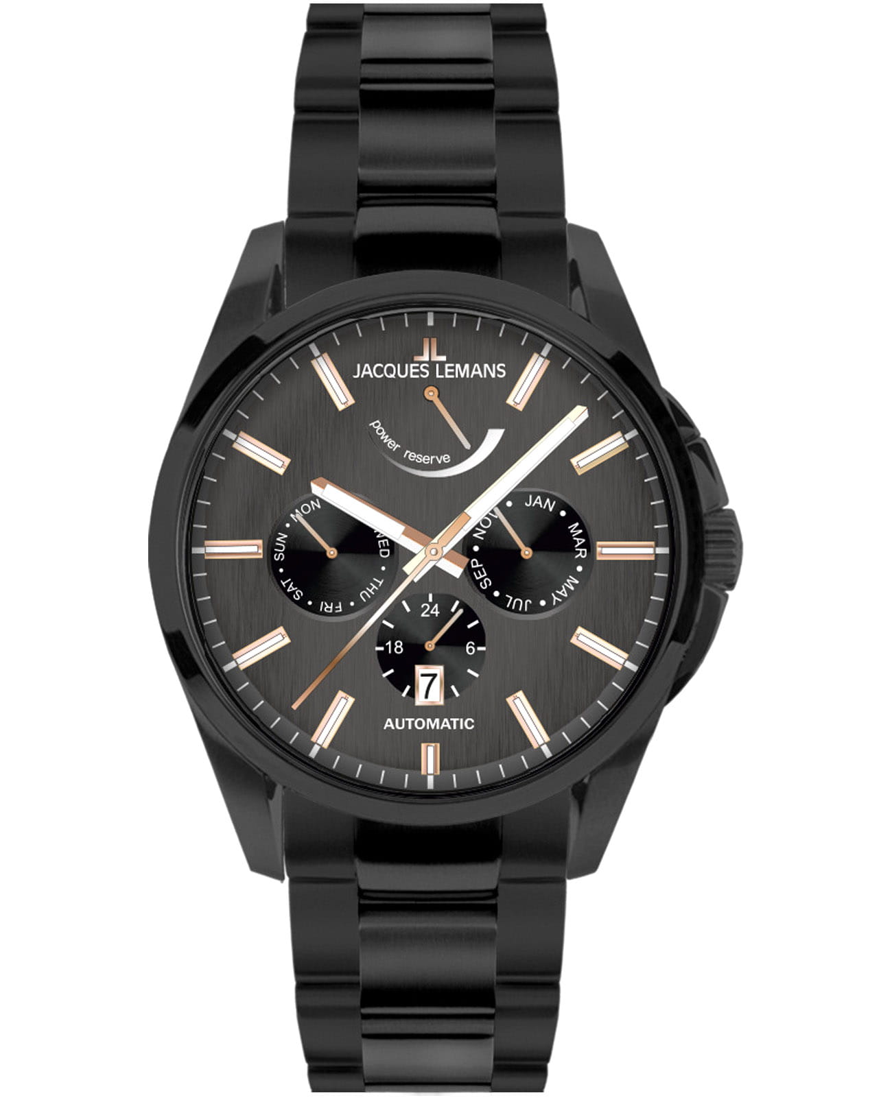 Мужские механические часы с автоподзаводом Jacques Lemans 1-2204C – лаконичная красота и изысканная элегантность. Оригинальная модель с классическим оформлением станет превосходным завершением образа, наделив его индивидуальным характером. Корпус выполнен из нержавеющей стали с PVD-покрытиемPVDУльтратонкое покрытие наносится в технике вакуумного напыления, сочетает в себе нитрид титана особой прочности со слоем золота или оксида хрома. Несёт в себе декоративную или защитную функцию. черного цвета, диаметром 44 мм, что обеспечивает долговечность и утончённый внешний вид. Минеральное стеклоМинеральное стеклоМинеральное стекло представляет собой искусственно выращенный минерал кварца. Такое стекло отличается особой устойчивостью к повреждениям и царапинам. Уступает по некоторым качествам сапфировому стеклу. с сапфировым напылением защищает циферблат от царапин. Стальной браслет на раскладной застёжкеРаскладная застёжкаТакой тип застёжки используется только на браслетах из металла. Она никогда не раскрывается полностью, происходит разделение на 2 и более частей. Раскладывающая застёжка снизит вероятность потери часов к минимуму. обеспечивает комфортное ношение. Водозащита 100 метров позволит плавать, нырять и заниматься другими водными видами спорта. Стрелки и метки с люминесцентным покрытиемЛюминесцентное покрытиеПозволяет считывать показания времени в темноте. Производители наносят на стрелки, часовые индексы, безель или поверхность циферблата светонакопительный состав, дающий холодное свечение. позволяющие легко определять время даже в темноте. Окошко даты находится в положении 6 часов. Индикатор 24-х часов, календарь недели и месяцев вынесены на отдельные циферблаты. Индикация запаса хода в положении 12 часов. Рифленая заводная головка с защитой. Это аксессуар для мужчины, который ценит классический стиль и функциональность.