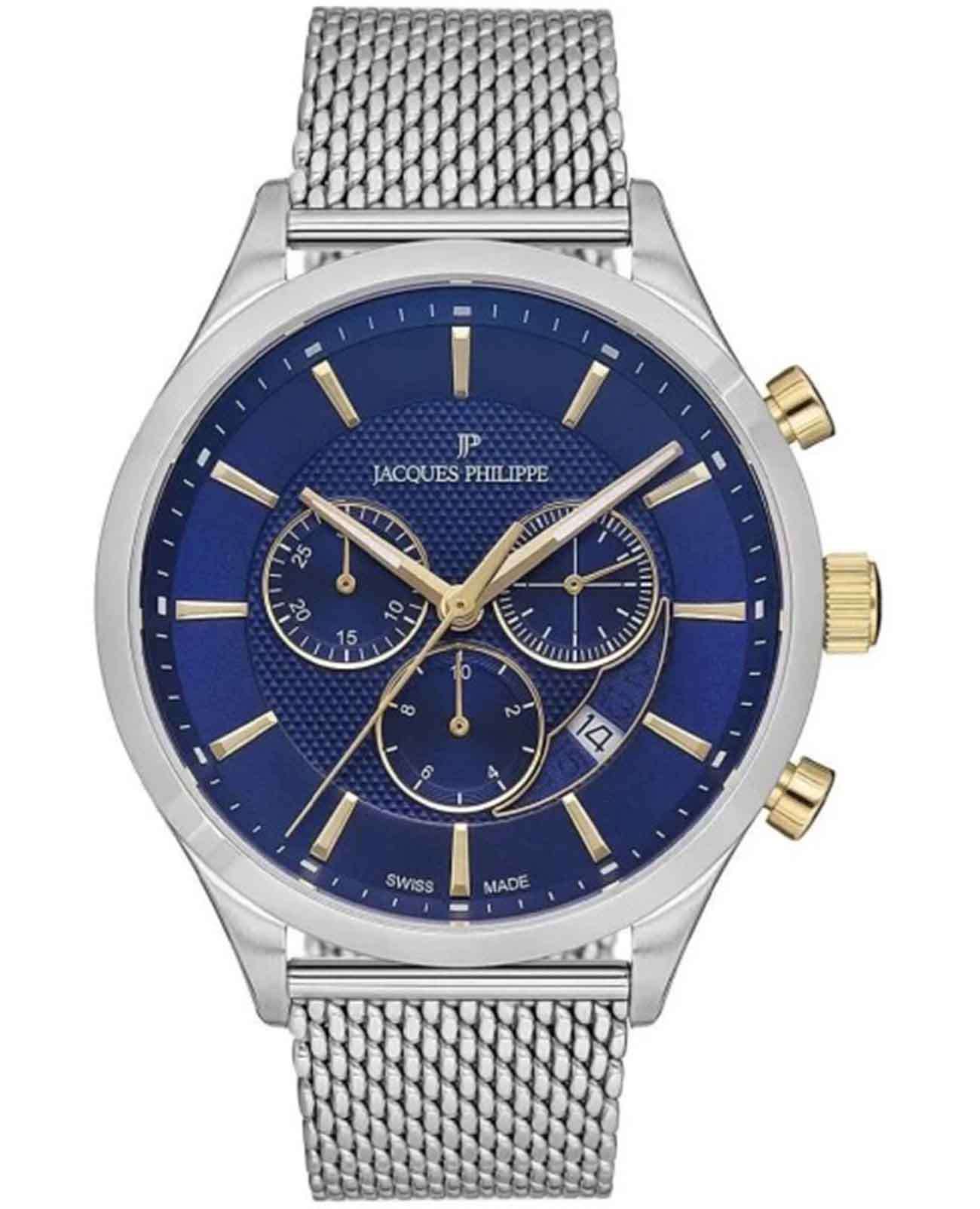 Часы Jacques Philippe Apollo JPQGC031236N — это гармоничное сочетание элегантного дизайна, современных швейцарских технологий и безупречного качества исполнения. Кварцевый механизм Ronda 5040.D.0001 обеспечивает точность хода. Модель оснащена точным кварцевым механизмом с функцией хронографаХронографФункция позволяет измерять отрезки времени с особой точностью: часы, минуты, секунды. Верным признаком хронографа является наличие на циферблате 3 дополнительных окошек-счётчиков. с секундомеромСекундомерСекундоме́р — прибор, способный измерять интервалы времени с точностью до долей секунды., что позволяет не только отслеживать время, но и использовать дополнительные возможности для активного образа жизни. Корпус диаметром 43 мм выполнен из прочной нержавеющей стали 316L, а сапфировое стеклоСапфировое стеклоПрочный и надёжный материал из кристалла сапфира синтетического происхождения, характеризующийся особой твёрдостью и устойчивостью к царапинам и повреждениям. надежно защищает синий циферблат от царапин и других повреждений. Окошко даты расположено между отметками 4 и 5 часов, что добавляет удобства в повседневном использовании. Для удобства использования в темное время суток предусмотрено люминесцентное покрытиеЛюминесцентное покрытиеПозволяет считывать показания времени в темноте. Производители наносят на стрелки, часовые индексы, безель или поверхность циферблата светонакопительный состав, дающий холодное свечение. стрелок. Браслет из нержавеющей стали с миланским плетением подчеркивает современный стиль изделия, а раскладной замокРаскладной замокДанный вариант застежки используется только на часах с металлическим браслетом. Отличительная особенность такого крепления в том, что длина браслета становится универсальной и вы можете самостоятельно отрегулировать нужный вам размер – застежка просто двигается по браслету часов. обеспечивает комфортное ношение и надежную фиксацию на запястье. Водозащита до 5 атмосфер позволяет не беспокоиться о случайных брызгах и дождевых каплях.