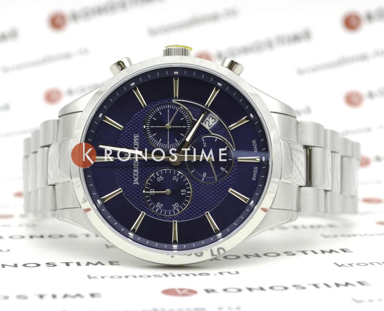 Швейцарские мужские часы-хронографХронографФункция позволяет измерять отрезки времени с особой точностью: часы, минуты, секунды. Верным признаком хронографа является наличие на циферблате 3 дополнительных окошек-счётчиков. Jacques Philippe Gallant JPQGC031336, кварцевый механизм с высокой точностью. Сапфировое стеклоСапфировое стеклоПрочный и надёжный материал из кристалла сапфира синтетического происхождения, характеризующийся особой твёрдостью и устойчивостью к царапинам и повреждениям. устойчивое к появлению царапин, обладающее высокой прозрачностью. Корпус часов изготовлен из нержавеющей стали. На циферблате три дополнительных индикатора. Стрелки с люминесцентным покрытиемЛюминесцентное покрытиеПозволяет считывать показания времени в темноте. Производители наносят на стрелки, часовые индексы, безель или поверхность циферблата светонакопительный состав, дающий холодное свечение.. Окошко даты находится между 4 и 5 часами. Класс водозащиты: 50 метров, позволит защитить корпус от случайных брызг или капель дождя. Стальной браслет на застёжке «бабочка» с кнопкамиЗастёжка "бабочка"Такой вид застёжки дополняется предохранителями, помогающими избежать случайного раскрытия браслета. Обладают изящным исполнением. .