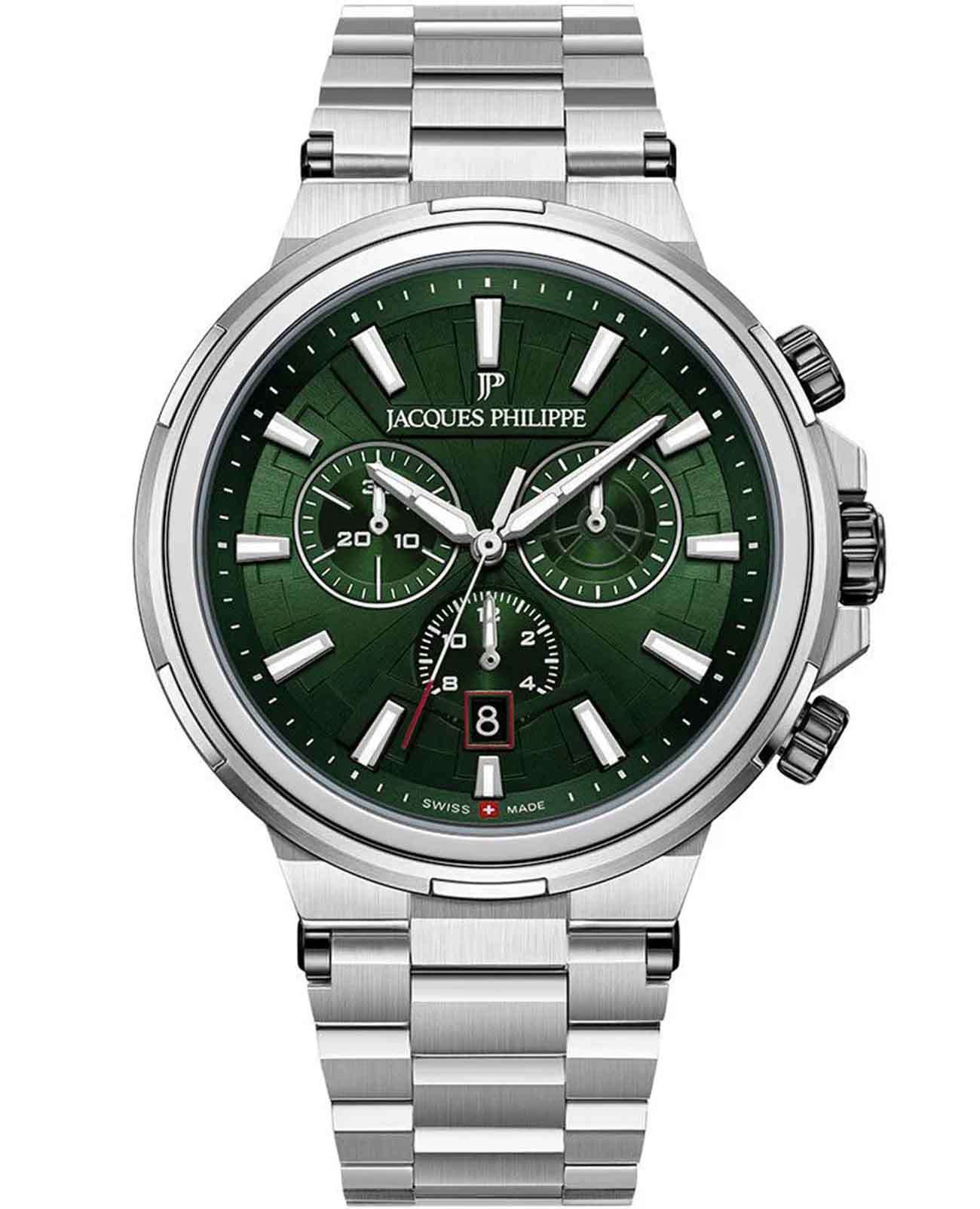 Jacques Philippe Corus JPQGC4413X6— стильные швейцарские часы с функцией хронографаХронографФункция позволяет измерять отрезки времени с особой точностью: часы, минуты, секунды. Верным признаком хронографа является наличие на циферблате 3 дополнительных окошек-счётчиков. и секундомераСекундомерСекундоме́р — прибор, способный измерять интервалы времени с точностью до долей секунды., которые сочетают в себе элегантность и современный функционал. Модель оснащена точным кварцевым механизмом и надежным корпусом из нержавеющей стали 316L, что гарантирует долговечность и устойчивость к механическим воздействиям. Сапфировое стеклоСапфировое стеклоПрочный и надёжный материал из кристалла сапфира синтетического происхождения, характеризующийся особой твёрдостью и устойчивостью к царапинам и повреждениям. отличается высокой прозрачностью и устойчивостью к царапинам, сохраняя безупречный внешний вид часов даже при активном использовании. Зеленый циферблат украшен тремя дополнительными индикаторами и удобным окошком даты в положении «4 часа», а стрелки с люминесцентным покрытиемЛюминесцентное покрытиеПозволяет считывать показания времени в темноте. Производители наносят на стрелки, часовые индексы, безель или поверхность циферблата светонакопительный состав, дающий холодное свечение. обеспечивают отличную читаемость в любое время суток. Браслет из нержавеющей стали подчеркивает современный стиль изделия, а застежка «бабочка»Застёжка "бабочка"Такой вид застёжки дополняется предохранителями, помогающими избежать случайного раскрытия браслета. Обладают изящным исполнением. , раскладывающаяся при нажатии кнопок двойной блокировки, обеспечивает комфортное ношение и надежную фиксацию на запястье. Класс водозащиты 10 ATM (100 метров) позволяет не снимать часы во время мытья рук или прогулок под дождем.