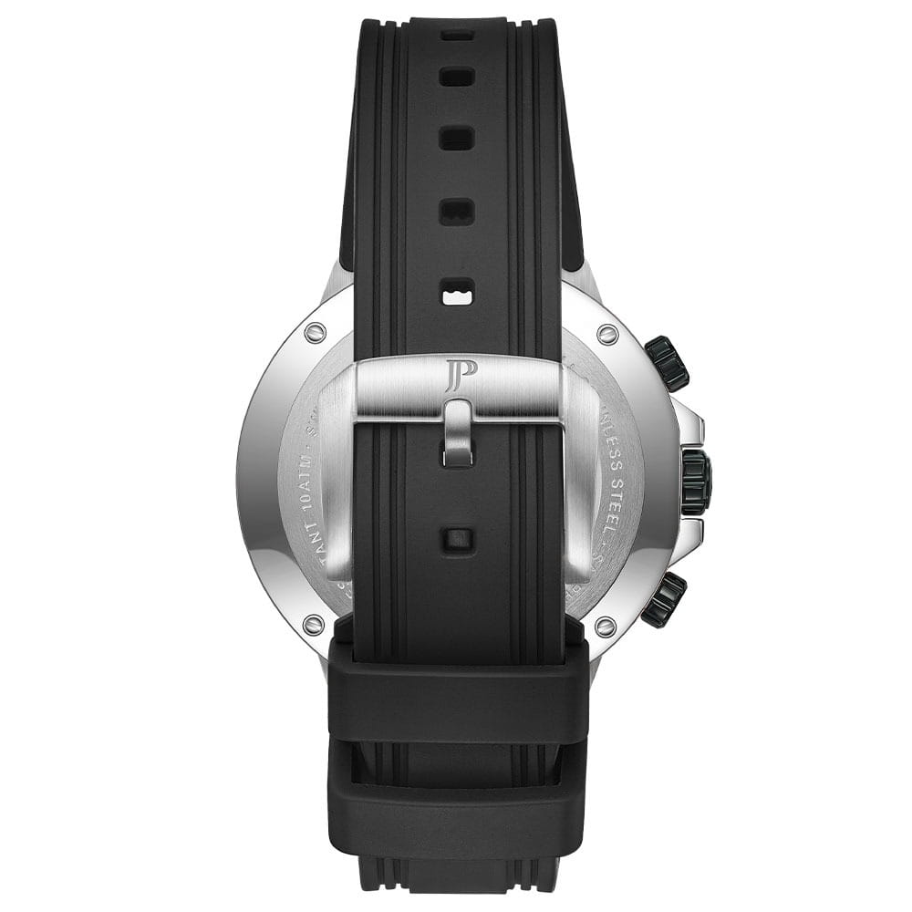 Jacques Philippe JPQGC447411SB — стильные швейцарские часы с функцией хронографаХронографФункция позволяет измерять отрезки времени с особой точностью: часы, минуты, секунды. Верным признаком хронографа является наличие на циферблате 3 дополнительных окошек-счётчиков. и секундомераСекундомерСекундоме́р — прибор, способный измерять интервалы времени с точностью до долей секунды., которые сочетают в себе элегантность и современный функционал. Круглый корпус диаметром 43 мм выполнен из серебристого металла, толщина корпуса составляет 12 мм, а на вращающийся безельБезельВнешний ободок, закрепляющий стекло. В спортивных часах так называется поворотное кольцо с делениями на циферблате, выполняет роль таймера – замеряет отрезки времени на шкале. Неподвижный безель – элемент декора. Однонаправленно вращающийся безель на дайверских часах позволяет фиксировать моменты погружения и выныривания на поверхность. нанесено черное IP-покрытиеIP-покрытиеМетод ионного напыления. Демонстрирует повышенную устойчивость к истиранию, окислению и химическим веществам. Под воздействием высокого давления и температуры около 1500°C молекулы металла надёжно соединяются с частицами корпуса часов., что придает модели выразительный внешний вид и надежную защиту от внешних воздействий. Часы оснащены кварцевым механизмом Ronda 5030.D также обладают функцией отображения даты, что делает их удобными для ежедневного использования. Черный циферблат гармонично сочетается с черным браслетом шириной 23 мм, который фиксируется классической застежкой. Сапфировое стеклоСапфировое стеклоПрочный и надёжный материал из кристалла сапфира синтетического происхождения, характеризующийся особой твёрдостью и устойчивостью к царапинам и повреждениям. защищает часы от царапин, а водозащита 10 АТМ позволяет не снимать их во время плавания и занятий спортом. Стрелки и метки с люминесцентным покрытиемЛюминесцентное покрытиеПозволяет считывать показания времени в темноте. Производители наносят на стрелки, часовые индексы, безель или поверхность циферблата светонакопительный состав, дающий холодное свечение. обеспечивают отличную читаемость в любое время суток.