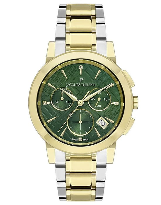 Швейцарские женские часы c хронографомХронографФункция позволяет измерять отрезки времени с особой точностью: часы, минуты, секунды. Верным признаком хронографа является наличие на циферблате 3 дополнительных окошек-счётчиков. Jacques Philippe Cosmos JPQLC3223X8N, кварцевый механизм с высокой точностью. Сапфировое стеклоСапфировое стеклоПрочный и надёжный материал из кристалла сапфира синтетического происхождения, характеризующийся особой твёрдостью и устойчивостью к царапинам и повреждениям. устойчивое к появлению царапин, обладающее высокой прозрачностью. Корпус часов изготовлен из нержавеющей стали с PVD-покрытиемPVDУльтратонкое покрытие наносится в технике вакуумного напыления, сочетает в себе нитрид титана особой прочности со слоем золота или оксида хрома. Несёт в себе декоративную или защитную функцию.. Класс водозащиты: 50 метров, позволит защитить корпус от случайных брызг или капель дождя. Стальной браслет с PVD-покрытиемPVDУльтратонкое покрытие наносится в технике вакуумного напыления, сочетает в себе нитрид титана особой прочности со слоем золота или оксида хрома. Несёт в себе декоративную или защитную функцию. на застёжке-бабочке с кнопкамиЗастёжка "бабочка"Такой вид застёжки дополняется предохранителями, помогающими избежать случайного раскрытия браслета. Обладают изящным исполнением. . Окошко даты находится в положении между 4 и 5 часов. Циферблат инкрустирован кристаллами.