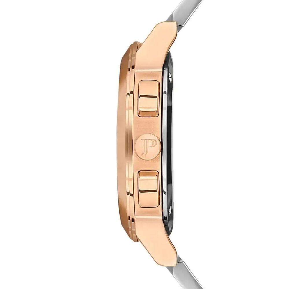 Швейцарские женские часы c хронографомХронографФункция позволяет измерять отрезки времени с особой точностью: часы, минуты, секунды. Верным признаком хронографа является наличие на циферблате 3 дополнительных окошек-счётчиков. Jacques Philippe Cosmos JPQLC323328N, кварцевый механизм с высокой точностью. Сапфировое стеклоСапфировое стеклоПрочный и надёжный материал из кристалла сапфира синтетического происхождения, характеризующийся особой твёрдостью и устойчивостью к царапинам и повреждениям. устойчивое к появлению царапин, обладающее высокой прозрачностью. Корпус часов изготовлен из нержавеющей стали с PVD-покрытиемPVDУльтратонкое покрытие наносится в технике вакуумного напыления, сочетает в себе нитрид титана особой прочности со слоем золота или оксида хрома. Несёт в себе декоративную или защитную функцию.. Класс водозащиты: 50 метров, позволит защитить корпус от случайных брызг или капель дождя. Стальной браслет с PVD-покрытиемPVDУльтратонкое покрытие наносится в технике вакуумного напыления, сочетает в себе нитрид титана особой прочности со слоем золота или оксида хрома. Несёт в себе декоративную или защитную функцию. на застёжке-бабочке с кнопкамиЗастёжка "бабочка"Такой вид застёжки дополняется предохранителями, помогающими избежать случайного раскрытия браслета. Обладают изящным исполнением. . Окошко даты находится в положении между 4 и 5 часов. Циферблат инкрустирован кристаллами.