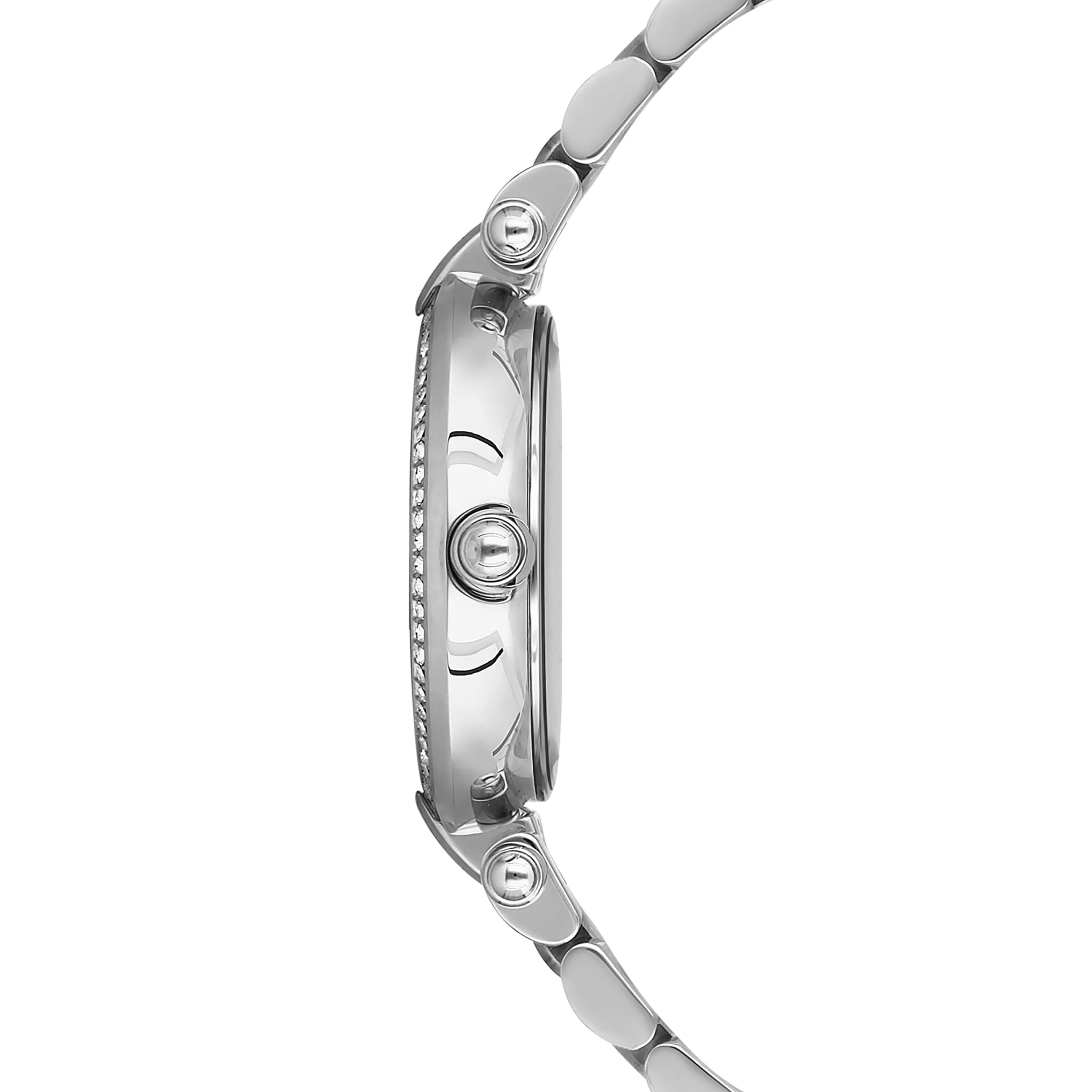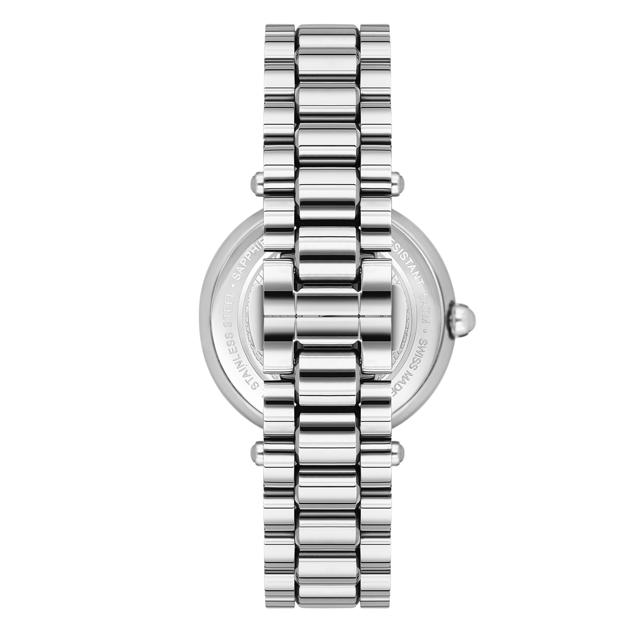 Швейцарские женские часы Jacques Philippe Mistress JPQLS081326, кварцевый механизм с высокой точностью. Сапфировое стеклоСапфировое стеклоПрочный и надёжный материал из кристалла сапфира синтетического происхождения, характеризующийся особой твёрдостью и устойчивостью к царапинам и повреждениям. устойчивое к появлению царапин, обладающее высокой прозрачностью. Корпус часов изготовлен из нержавеющей стали. Класс водозащиты: 50 метров, позволит защитить корпус от случайных брызг или капель дождя. Стальной браслет на застёжке-бабочке с кнопкамиЗастёжка "бабочка"Такой вид застёжки дополняется предохранителями, помогающими избежать случайного раскрытия браслета. Обладают изящным исполнением. . Циферблат и безельБезельВнешний ободок, закрепляющий стекло. В спортивных часах так называется поворотное кольцо с делениями на циферблате, выполняет роль таймера – замеряет отрезки времени на шкале. Неподвижный безель – элемент декора. Однонаправленно вращающийся безель на дайверских часах позволяет фиксировать моменты погружения и выныривания на поверхность. инкрустированы кристаллами. Окошко даты находится в положении 6 часов.