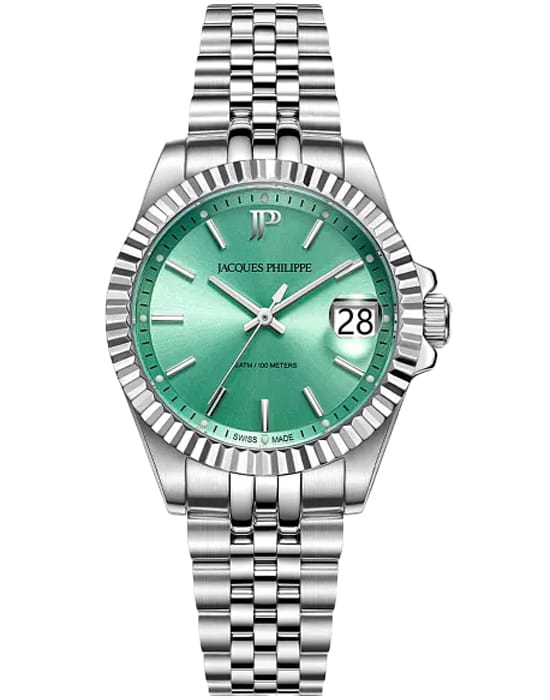 Часы Jacques Philippe JPQLS5813X6LG из коллекции Adastra — элегантные женские часы, сочетающие в себе швейцарское качество и современный дизайн. Корпус диаметром 34 мм выполнен из нержавеющей стали, а зеленый циферблат защищён сапфировым стекломСапфировое стеклоПрочный и надёжный материал из кристалла сапфира синтетического происхождения, характеризующийся особой твёрдостью и устойчивостью к царапинам и повреждениям.. Внутри установлен швейцарский кварцевый механизм, обеспечивающий высокую точность хода. Водозащита 50 метров (5 ATM) защищает часы от брызг и дождя. Браслет из нержавеющей стали с застёжкой бабочкаЗастёжка "бабочка"Такой вид застёжки дополняется предохранителями, помогающими избежать случайного раскрытия браслета. Обладают изящным исполнением. обеспечивает комфортное ношение и надёжную фиксацию на запястье. Эти часы подойдут для тех, кто ценит сочетание элегантного дизайна и функциональности.