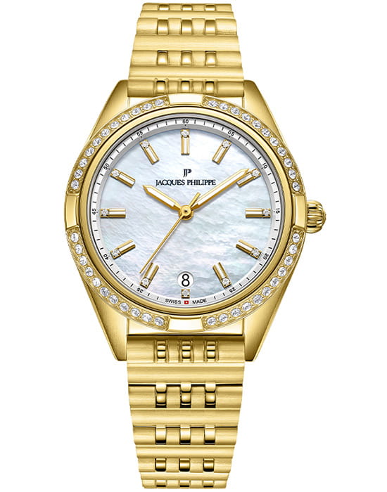Jacques Philippe Radiante JPQLS682384 — изящная женская модель коллекции Radiante с кварцевым механизмом, сочетающая классический стиль и практичность. Корпус диаметром 33 мм выполнен из нержавеющей стали с PVDPVDУльтратонкое покрытие наносится в технике вакуумного напыления, сочетает в себе нитрид титана особой прочности со слоем золота или оксида хрома. Несёт в себе декоративную или защитную функцию.-покрытием и полированными поверхностями, безельБезельВнешний ободок, закрепляющий стекло. В спортивных часах так называется поворотное кольцо с делениями на циферблате, выполняет роль таймера – замеряет отрезки времени на шкале. Неподвижный безель – элемент декора. Однонаправленно вращающийся безель на дайверских часах позволяет фиксировать моменты погружения и выныривания на поверхность. инкрустирован кристаллами, что придаёт часам утончённый блеск. Водозащита до 5 атм (50 м) позволяет носить модель в повседневных условиях. Выпуклое сапфировое стеклоСапфировое стеклоПрочный и надёжный материал из кристалла сапфира синтетического происхождения, характеризующийся особой твёрдостью и устойчивостью к царапинам и повреждениям. обеспечивает защиту от царапин и сохраняет высокую прозрачность, делая циферблат легко читаемым. Модель оснащена точным швейцарским кварцевым механизмом с индикацией часов, минут и секунд. Циферблат оформлен в лаконичном стиле с аккуратными метками, а браслет из нержавеющей стали с PVDPVDУльтратонкое покрытие наносится в технике вакуумного напыления, сочетает в себе нитрид титана особой прочности со слоем золота или оксида хрома. Несёт в себе декоративную или защитную функцию.-покрытием гармонично завершает образ, подчёркивая универсальность и элегантность этих часов.