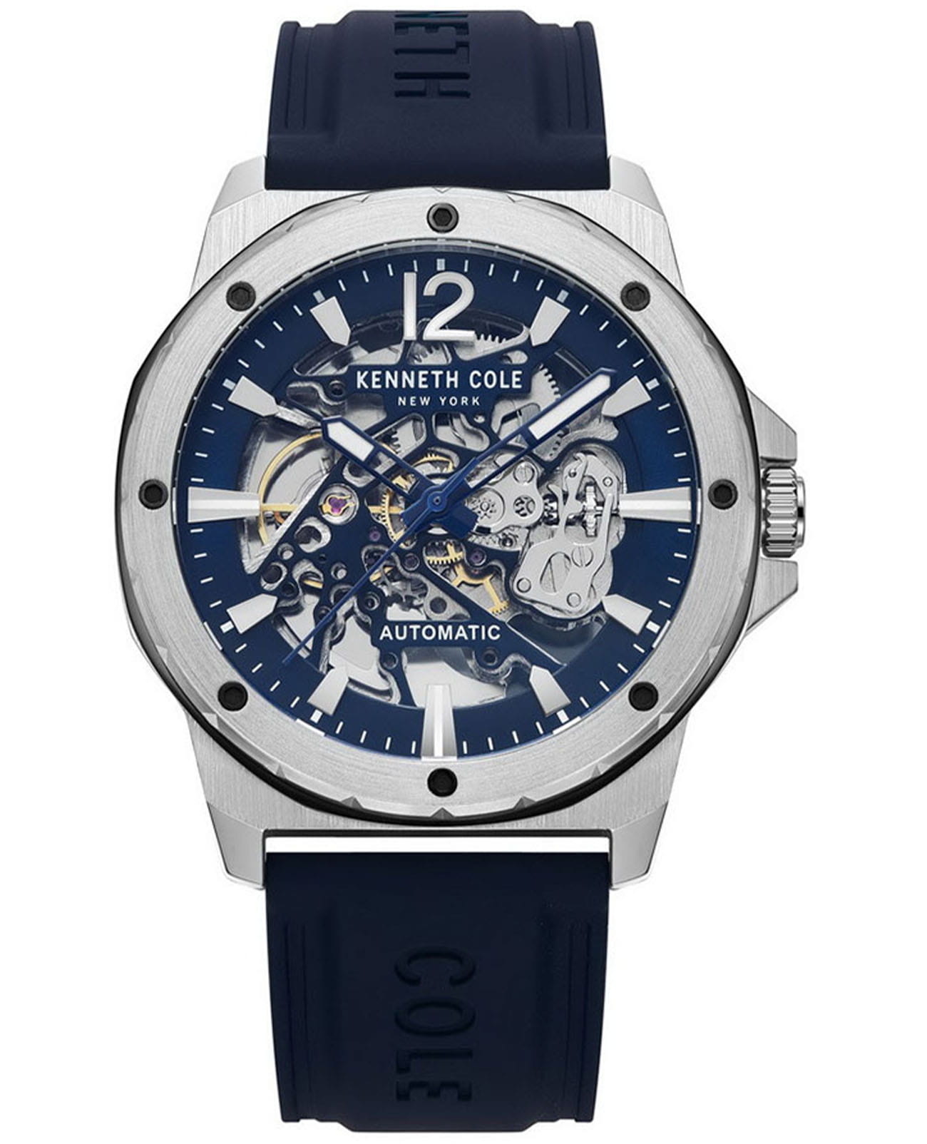 Мужские механические часы-скелетоны с минеральным стекломМинеральное стеклоМинеральное стекло представляет собой искусственно выращенный минерал кварца. Такое стекло отличается особой устойчивостью к повреждениям и царапинам. Уступает по некоторым качествам сапфировому стеклу. Kenneth Cole Automatic KCWGR2217402, механический механизм (автоматический калибр) с высокой точностью. Класс водозащиты: 30 метров, позволит защитить корпус от случайных брызг или капель дождя. Корпус часов изготовлен из стали. Синий каучуковый ремешок на стандартной застёжке. Стрелки и метки с люминесцентным покрытиемЛюминесцентное покрытиеПозволяет считывать показания времени в темноте. Производители наносят на стрелки, часовые индексы, безель или поверхность циферблата светонакопительный состав, дающий холодное свечение..