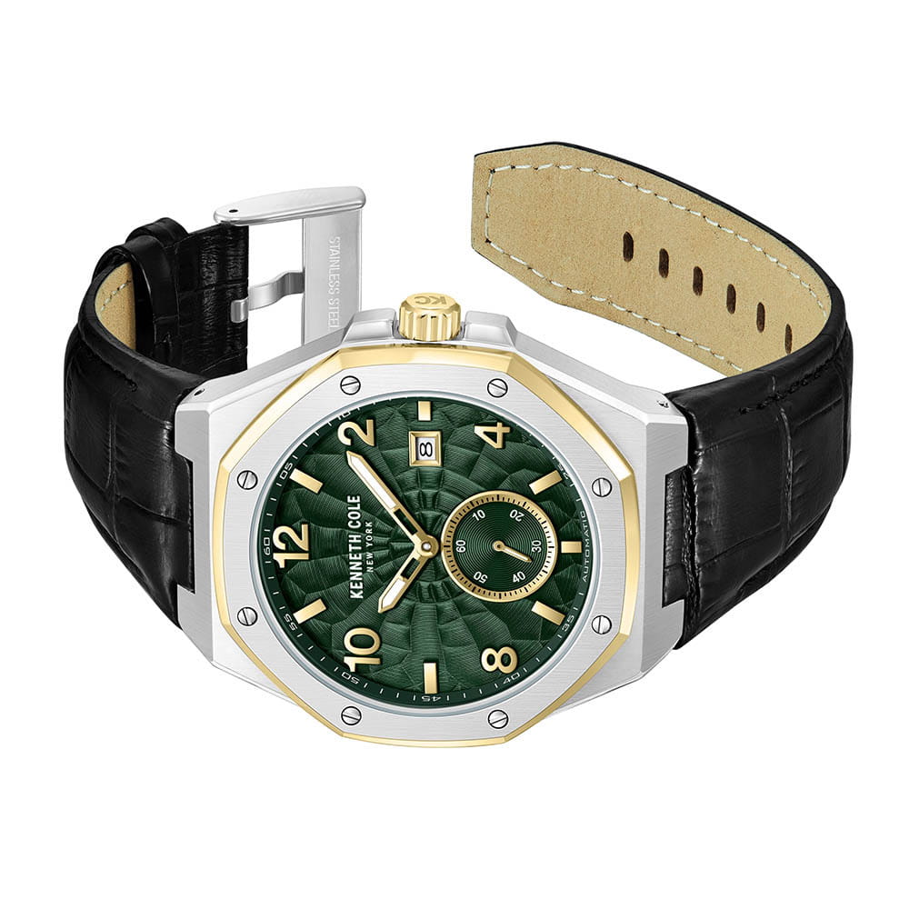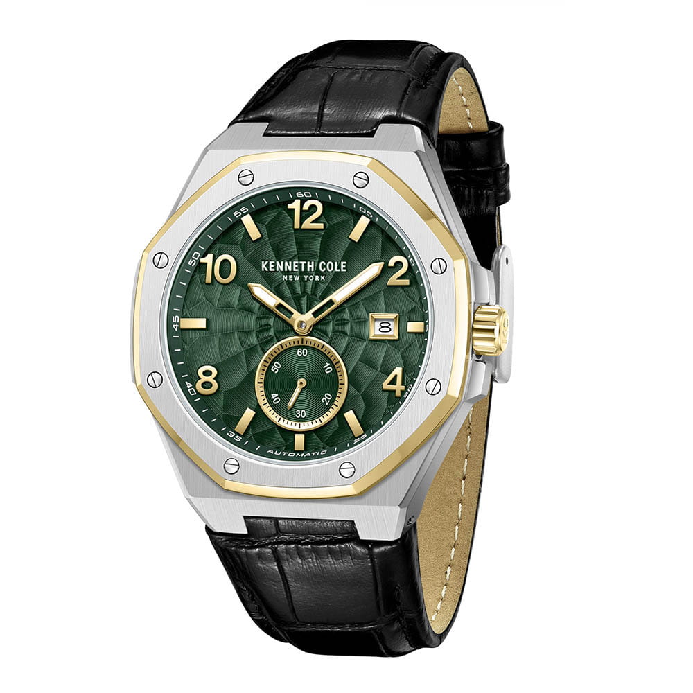 Мужские механические часы с автоподзаводом Kenneth Cole KCWGX0059003 — это стильный и современный аксессуар с выразительным дизайном. Корпус размером 43 мм, безель выполнен из стали с элементами IP-покрытиемIP-покрытиеМетод ионного напыления. Демонстрирует повышенную устойчивость к истиранию, окислению и химическим веществам. Под воздействием высокого давления и температуры около 1500°C молекулы металла надёжно соединяются с частицами корпуса часов. золотого цвета. Циферблат зелёного цвета оснащён люминесцентным покрытиемЛюминесцентное покрытиеПозволяет считывать показания времени в темноте. Производители наносят на стрелки, часовые индексы, безель или поверхность циферблата светонакопительный состав, дающий холодное свечение. и оформлен метками в виде арабских цифр и штрихов, а секундная стрелка вынесена на отдельный малый циферблат. Окошко даты расположено в положении 3 часов. Циферблат защищён минеральным стекломМинеральное стеклоМинеральное стекло представляет собой искусственно выращенный минерал кварца. Такое стекло отличается особой устойчивостью к повреждениям и царапинам. Уступает по некоторым качествам сапфировому стеклу.. Часы оснащены ремешком из натуральной кожи чёрного цвета с классической пряжкой. Водонепроницаемость 50 м позволяет использовать часы для плавания и повседневного ношения. Лаконично и со вкусом.